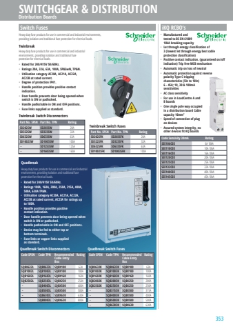 353SWITCHGEAR & DISTRIBUTION%u2022 Manufactured and tested to BS EN 61009 10kA breaking capacity%u2022 Let through energy classification of 3 (lowest let through energy best cable protection classification)%u2022 Positive contact indication. (guaranteed on/off indication) Trip free MCB mechanism%u2022 Automatic trip on loss of neutral%u2022 Automatic protection against reverse polarity Type C tripping characteristics (5ln to 10ln) 6 - 45A; 10, 30 & 100mA sensitivities%u2022 AC class sensitivity%u2022 For use in LoadCentre A and B boards%u2022 One single pole way occupied in a distribution board Cable capacity 16mm2%u2022 Speed of connection of plug on devices%u2022 Assured system integrity, no other devices fit KQ boardsHeavy duty fuse products for use in commercial and industrial environments, providing isolation and traditional fuse protection for electrical loads.TwinbreakHeavy duty fuse products for use in commercial and industrial environments, providing isolation and traditional fuse protection for electrical loads.%u2022 Rated for 240/415V 50/60Hz.%u2022 Ratings 20A, 32A, 63A, 100A, SP&SwN, TP&N.%u2022 Utilisation category AC20A, AC21A, AC22A, AC23B at rated current.%u2022 Degree of protection IP41.%u2022 Handle position provides positive contact indication.%u2022 Door handle prevents door being opened when switch is ON or padlocked.%u2022 Handle padlockable in ON and OFF positions.%u2022 Fuse links supplied as standard.Distribution BoardsSwitch FusesTwinbreak Switch DisconnectorsPart No. SPSN Part No. TPN RatingSD202SW SD203SW 20ASD322SW SD323SW 32ASD632SW SD633SW 63ASD1002SW SD1003SW 100A - SD1253SW 125A - SD1603SW 160ATwinbreak Switch FusesPart No. SPSN Part No. TPN RatingSD202SFK SD203SFK 20ASD322SFK SD323SFK 32ASD632SFK SD633SFK 63ASD1002SFK SD1003SFK 100AQuadbreakQuadbreak Switch DisconnectorsCode SPSN Code TPN Recommended Cable Entry Box RatingSQB0632L SQB0633L SQBX100 63ASQB1002L SQB1003L SQBX100 100ASQB1602L SQB1603L SQBX160 160ASQB2502L SQB2503L SQBX250 250A - SQB4003L SQBX500 400A - SQB5003L SQBX500 500A - SQB6303L SQBX630 630A - SQB8003L SQBX630 800AHeavy duty fuse products for use in commercial and industrial environments, providing isolation and traditional fuse protection for electrical loads.%u2022 Rated for 240/415V 50/60Hz.%u2022 Ratings 100A, 160A, 200A, 250A, 315A, 400A, 500A, 630A TP&N.%u2022 Utilisation category AC20A, AC21A, AC22A, AC23B at rated current, AC23A for ratings up to 160A.%u2022 Handle position provides positive contact indication.%u2022 Door handle prevents door being opened when switch is ON or padlocked.%u2022 Handle padlockable in ON and OFF positions.%u2022 Device may be fed to either top or bottom terminals.%u2022 Fuse links or copper links supplied as standard.Quadbreak Switch FusesCode SPSN Code TPN Recommended Cable Entry Box RatingSQB0632K SQB0633K SQBX100 63ASQB1002K SQB1003K SQBX100 100ASQB1602K SQB1603K SQBX160 160ASQB2002K SQB2003K SQBX250 200ASQB2502K SQB2503K SQBX250 250A - SQB3153K SQBX500 315A - SQB4003K SQBX500 400A - SQB5003K SQBX500 500A - SQB6303K SQBX630 630ACode Sensivity 30mA RatingSEE106C03 6A 10kASEE110C03 10A 10kASEE116C03 16A 10kASEE120C03 20A 10kASEE125C03 25A 10kASEE132C03 32A 10kASEE140C03 40A 10kASEE145C03 45A 10kAiKQ RCBO%u2019s