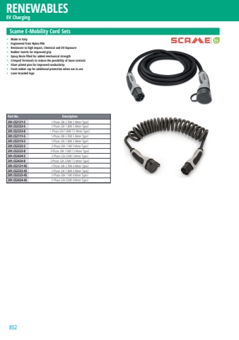 RENEWABLES852EV Charging Scame E-Mobility Cord Sets%u2022 Made in Italy%u2022 Engineered from Nylon PA6%u2022 Resistance to high impact, Chemical and UV Exposure%u2022 Rubber Inserts for improved grip%u2022 Epoxy Resin filled for added mechanical strength%u2022 Crimped Terminals to reduce the possibility of loose contacts%u2022 Silver plated pins for improved conductivity%u2022 Fixed rubber cap for additional protection when not in use%u2022 Laser branded logoPart No. Description201.CS2121-5 1-Phase 20A 3.7kW 5 Meter Type2201.CS2323-5 1-Phase 32A 7.4kW 5 Meter Type2201.CS2323-8 1-Phase 32A 7.4kW 7.5 Meter Type2201.CS2111-5 1-Phase 20A 3.7kW 5 Meter Type1201.CS2313-5 1-Phase 32A 7.4kW 5 Meter Type1201.CS2222-5 3-Phase 20A 11kW 5 Meter Type2201.CS2222-8 3-Phase 20A 11kW 7.5 Meter Type2201.CS2424-5 3-Phase 32A 22kW 5 Meter Type2201.CS2424-8 3-Phase 32A 22kW 7.5 Meter Type2201.CS2121-4S 1-Phase 20A 3.7kW 4 Meter Type2201.CS2323-4S 1-Phase 32A 7.4kW 4 Meter Type2201.CS2222-4S 3-Phase 20A 11kW 4 Meter Type2201.CS2424-4S 3-Phase 32A 22kW 4 Meter Type2