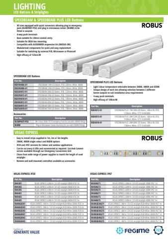769LIGHTINGTogether we GENERATE VALUELED Battens & StriplightsSPEEDBEAM & SPEEDBEAM PLUS LED Battens%u2022 All sizes equipped with quick connectors allowing plug-in emergency pack (RLEMPKDT-PSU) and plug in microwave sensor (RLMW) to be fitted in seconds%u2022 4-way push terminals%u2022 Base suitable for 20mm conduit entry%u2022 Suitable for BESA box mounting%u2022 Compatible with ALEXANDER suspension kit (RAESUS-2W)%u2022 Modularised components for quick and easy replacement%u2022 Suitable for switching by external PIR, Microwave or Photocell%u2022 High efficacy of 125Lm/WPart No. DescriptionRSB104006-01 SPEEDBEAM 10W LED Batten, IP20, 630mm, White, 4000KRSB204006-01 SPEEDBEAM 20W LED Batten, IP20, 630mm, White, 4000KRSB204012-01 SPEEDBEAM 20W LED Batten, IP20, 1230mm, White, 4000KRSB294015-01 SPEEDBEAM 29W LED Batten, IP20, 1530mm, White, 4000KRSB394018-01 SPEEDBEAM 39W LED Batten, IP20, 1780mm, White, 4000KRSB404012-01 SPEEDBEAM 40W LED Batten, IP20, 1230mm, White, 4000KRSB584015-01 SPEEDBEAM 58W LED Batten, IP20, 1530mm, White, 4000KRSB764018-01 SPEEDBEAM 76W LED Batten, IP20, 1780mm, White, 4000KSPEEDBEAM PLUS LED BattensPart No. DescriptionRSBX012-01 SPEEDBEAM PLUS 17W/34W LED Batten, 140Lm/W, IP20, 1230mm, White, CCT3 3/4/6500KRSBX015-01 SPEEDBEAM PLUS 26W/52W LED Batten, 140Lm/W, IP20, 1530mm, White, CCT3 3/4/6500KRSBX018-01 SPEEDBEAM PLUS 34W/68W LED Batten, 140Lm/W, IP20, 1780mm, White, CCT3 3/4/6500KSPEEDBEAM LED BattensrobusVEGAS EXPRESSrobus%u2022 Light Colour temperature selectable between 3000K, 4000K and 6500K%u2022 Unique design of each size allowing selection between 2 different lumen outputs to suit installation area requirements%u2022 4-way push terminals%u2022 High efficacy of 140Lm/WAccessoriesPart No. DescriptionRLEMPKDT-PSU 2W 3 Hour DUAL TEST Emergency Pack for use with LINEAR FittingsRLMW Plug-in Microwave Sensor Accessory for use with LINEAR FittingsPart No. DescriptionRVA3K1 VEGAS EXPRESS 4.8W/m 12V LED striplight 3000K IP20 1mRVA3K3 VEGAS EXPRESS 4.8W/m 12V LED striplight 3000K IP20 3mRVA3K5 VEGAS EXPRESS 4.8W/m 12V LED striplight 3000K IP20 5mRVA4K1 VEGAS EXPRESS 4.8W/m 12V LED striplight 4000K IP20 1mRVA4K3 VEGAS EXPRESS 4.8W/m 12V LED striplight 4000K IP20 3mRVA4K5 VEGAS EXPRESS 4.8W/m 12V LED striplight 4000K IP20 5mRVARGB3K1 VEGAS EXPRESS 14W/m 12V LED striplight RGB+White 3000K IP20 1mRVARGB3K3 VEGAS EXPRESS 14W/m 12V LED striplight RGB+White 3000K IP20 3mRVARGB3K5 VEGAS EXPRESS 14W/m 12V LED striplight RGB+White 3000K IP20 5mRVARGB4K1 VEGAS EXPRESS 14W/m 12V LED striplight RGB+White 4000K IP20 1mRVARGB4K3 VEGAS EXPRESS 14W/m 12V LED striplight RGB+White 4000K IP20 3mRVARGB4K5 VEGAS EXPRESS 14W/m 12V LED striplight RGB+White 4000K IP20 5mVEGAS EXPRESS IP20Part No. DescriptionRVA3K671 VEGAS EXPRESS 4.8W/m 12V LED striplight 3000K IP67 1mRVA3K673 VEGAS EXPRESS 4.8W/m 12V LED striplight 3000K IP67 3mRVA3K675 VEGAS EXPRESS 4.8W/m 12V LED striplight 3000K IP67 5mRVA4K671 VEGAS EXPRESS 4.8W/m 12V LED striplight 4000K IP67 1mRVA4K673 VEGAS EXPRESS 4.8W/m 12V LED striplight 4000K IP67 3mRVA4K675 VEGAS EXPRESS 4.8W/m 12V LED striplight 4000K IP67 5mRVARGB3K671 VEGAS EXPRESS 14W/m 12V LED striplight RGB+White 3000K IP67 1mRVARGB3K673 VEGAS EXPRESS 14W/m 12V LED striplight RGB+White 3000K IP67 3mRVARGB3K675 VEGAS EXPRESS 14W/m 12V LED striplight RGB+White 3000K IP67 5mRVARGB4K671 VEGAS EXPRESS 14W/m 12V LED striplight RGB+White 4000K IP67 1mRVARGB4K673 VEGAS EXPRESS 14W/m 12V LED striplight RGB+White 4000K IP67 3mRVARGB4K675 VEGAS EXPRESS 14W/m 12V LED striplight RGB+White 4000K IP67 5mVEGAS EXPRESS IP67%u2022 Easy to install strips supplied in 1m, 3m or 5m lengths %u2022 3000K, 4000K single colour and RGBW options%u2022 IP20 and IP67 versions for indoor and outdoor applications%u2022 Can be cut every 6 LEDs and reconnected as required. Cut-And-Connect service available through our Emergency Conversions Unit %u2022 Chose from wide range of power supplies to match the length of used striplight %u2022 Remote and wall mounted controllers available as accessories