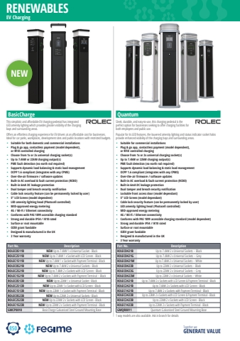 Together we GENERATE VALUERENEWABLES850EV Charging Part No. DescriptionROLEC0421B Up to 7.4kW 2 x Universal Sockets %u2013 BlackROLEC0421G Up to 7.4kW 2 x Universal Sockets %u2013 GreyROLEC0421W Up to 7.4kW 2 x Universal Sockets %u2013 WhiteROLEC0423B Up to 22kW 2 x Universal Sockets %u2013 BlackROLEC0423G Up to 22kW 2 x Universal Sockets %u2013 GreyROLEC0423W Up to 22kW 2 x Universal Sockets %u2013 WhiteROLEC3421B Up to 7.4kW 2 x Sockets with LCD Screen & Payment Terminal - BlackROLEC2421B Up to 7.4kW 2 x Sockets with LCD Screen - BlackROLEC1421B Up to 7.4kW 2 x Sockets with Payment Terminal - BlackROLEC3423B Up to 22kW 2 x Sockets with LCD Screen & Payment Terminal - BlackROLEC2423B Up to 22kW 2 x Sockets with LCD Screen - BlackROLEC1423B Up to 22kW 2 x Sockets with Payment Terminal - BlackGMQR0011 Quantum Galvanised Steel Ground Mounting Base1 way models are also available. Ask in branch for detailsThis simplistic and affordable EV charging pedestal has integrated LED amenity lighting which provides greater visibility of the charging bays and surrounding areas.Offers an effortless charging experience for EV drivers at an affordable cost for businesses. Ideal for car parks, workplaces, development sites and public locations with restricted budgets.Part No. DescriptionROLEC0511B NEW Up to 7.4kW 1 x Universal Socket - BlackROLEC2511B NEW Up to 7.4kW 1 x Socket with LCD Screen - BlackROLEC1511B NEW Up to 7.4kW 1 x Socket with Payment Terminal - BlackROLEC0521B NEW Up to 7.4kW 2 x Universal Sockets - BlackROLEC2521B NEW Up to 7.4kW 2 x Sockets with LCD Screen - BlackROLEC1521B NEW Up to 7.4kW 2 x Sockets with Payment Terminal %u2013 BlackROLEC0513B NEW Up to 22kW 1 x Universal Socket - BlackROLEC2513B NEW Up to 22kW 1 x Socket with LCD Screen - BlackROLEC1513B NEW Up to 22kW 1 x Socket with Payment Terminal - BlackROLEC0523B NEW Up to 22kW 2 x Universal Sockets - BlackROLEC2523B NEW Up to 22kW 2 x Sockets with LCD Screen - BlackROLEC1523B NEW Up to 22kW 2 x Sockets with Payment Terminal - BlackGMCP0010 BasicCharge Galvanised Steel Ground Mounting Base%u2022 Suitable for both domestic and commercial installations%u2022 Plug & go app, contactless payment (model dependent), or RFID controlled charging%u2022 Choose from 1x or 2x universal charging socket(s) %u2022 Up to 7.4kW or 22kW charging output(s)%u2022 PME fault detection (no earth rod required)%u2022 Supports dynamic load balancing & static load management%u2022 OCPP 1.6 compliant (integrates with any CPMS)%u2022 Over-the-air firmware / software updates%u2022 Built-in AC overload & fault current protection (RCBO)%u2022 Built-in 6mA DC leakage protection%u2022 Dual tamper and breach security notification%u2022 Cable lock security feature (can be permanently locked by user)%u2022 5%u201d LCD Screen (model dependent)%u2022 LED amenity lighting head (Photocell controlled)%u2022 MID-approved energy metering%u2022 4G / Wi-Fi / Ethernet connectivity%u2022 Conforms with PAS 1899 accessible charging standard%u2022 Strong and durable IP54 / IK10 rated%u2022 Surface or root mountable%u2022 OZEV grant fundable%u2022 Designed & manufactured in the UK%u2022 3 Year warrantyQuantum%u2022 Suitable for commercial installations%u2022 Plug & go app, contactless payment (model dependent), or RFID controlled charging %u2022 Choose from 1x or 2x universal charging socket(s)%u2022 Up to 7.4kW or 22kW charging output(s)%u2022 PME fault detection (no earth rod required)%u2022 Supports dynamic load balancing & static load management%u2022 OCPP 1.6 compliant (integrates with any CPMS) %u2022 Over-the-air firmware / software updates%u2022 Built-in AC overload & fault current protection (RCBO)%u2022 Built-in 6mA DC leakage protection%u2022 Dual tamper and breach security notification%u2022 Lockable front access door (model dependant)%u2022 5%u201d LCD Screen (model dependant)%u2022 Cable lock security feature (can be permanently locked by user)%u2022 LED amenity lighting head (Photocell controlled)%u2022 MID-approved energy metering%u2022 4G / Wi-Fi / Ethernet connectivity%u2022 Conforms with PAS 1899 accessible charging standard (model dependent)%u2022 Strong and durable IP54 / IK10 rated%u2022 Surface or root mountable%u2022 OZEV grant fundable%u2022 Designed & manufactured in the UK%u2022 3 Year warrantySleek, durable, and easy-to-use, this charging pedestal is the perfect option for businesses seeking to offer charging facilities for both employees and public use.Popular for its LED features, the louvered amenity lighting and status indicator socket halos provide enhanced visibility of the charging bays and surrounding areas.BasicChargeNEW