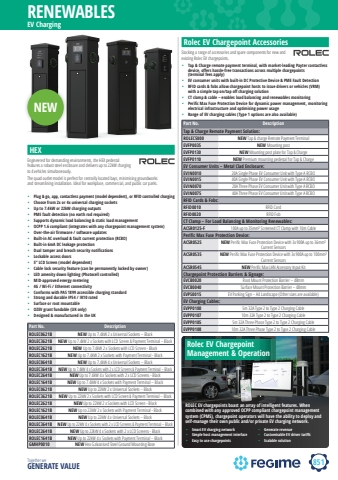 851 Together we GENERATE VALUERENEWABLESRolec EV Chargepoint AccessoriesEV Charging Part No. DescriptionTap & Charge Remote Payment Solution: ROLEC5000 NEW Tap & charge Remote Payment Terminal EVFP0035 NEW Mounting post EVFP0130 NEW Mounting post plate for Tap & ChargeEVFP0110 NEW Premium mounting pedestal for Tap & ChargeEV Consumer Units %u2013 Metal Clad Enclosure:EVIN0010 20A Single Phase EV Consumer Unit with Type A RCBOEVIN0015 40A Single Phase EV Consumer Unit with Type A RCBO EVIN0070 20A Three Phase EV Consumer Unit with Type A RCBOEVIN0075 40A Three Phase EV Consumer Unit with Type A RCBORFID Cards & Fobs:RFID0010 RFID CardRFID0020 RFID FobCT Clamp %u2013 For Load Balancing & Monitoring Renewables:ACSR0125-F 100A up to 35mm%u00b2 Screened CT Clamp with 10m CablePerific Max Fuse Protection Device:ACSR0525 NEW Perific Max Fuse Protection Device with 3x 900A up to 36mm%u00b2 Current Sensors ACSR0535 NEW Perific Max Fuse Protection Device with 3x 900A up to 100mm%u00b2 Current Sensors ACSR0545 NEW Perific Max LAN Accessory Input Kit Chargepoint Protection Barriers & Signage:EVCB0020 Root Mount Protection Barrier %u2013 48mmEVCB0040 Surface Mount Protection Barrier %u2013 48mmEVPS0015 EV Parking Sign %u2013 A4 Landscape (Other sizes are available)EV Charging Cables:EVPP0100 5m 32A Type 2 to Type 2 Charging CableEVPP0107 10m 32A Type 2 to Type 2 Charging CableEVPP0105 5m 32A Three Phase Type 2 to Type 2 Charging CableEVPP0108 10m 32A Three Phase Type 2 to Type 2 Charging Cable%u2022 Tap & Charge remote payment terminal, with market-leading Payter contactless device, offers hassle-free transactions across multiple chargepoints (terminal fees apply)%u2022 EV consumer units with built-in DC Protective Device & PME Fault Detection%u2022 RFID cards & fobs allow chargepoint hosts to issue drivers or vehicles (VRM) with a simple tap on/tap off charging solution%u2022 CT clamp & cable %u2013 enables load balancing and renewables monitoring%u2022 Perific Max Fuse Protection Device for dynamic power management, monitoring electrical infrastructure and optimising power usage%u2022 Range of EV charging cables (Type 1 options are also available)Stocking a range of accessories and spare components for new and existing Rolec EV chargepoints.HEX%u2022 Plug & go, app, contactless payment (model dependent), or RFID controlled charging%u2022 Choose from 2x or 4x universal charging sockets %u2022 Up to 7.4kW or 22kW charging outputs%u2022 PME fault detection (no earth rod required)%u2022 Supports dynamic load balancing & static load management%u2022 OCPP 1.6 compliant (integrates with any chargepoint management system)%u2022 Over-the-air firmware / software updates%u2022 Built-in AC overload & fault current protection (RCBO)%u2022 Built-in 6mA DC leakage protection%u2022 Dual tamper and breach security notifications%u2022 Lockable access doors%u2022 5%u201d LCD Screen (model dependent)%u2022 Cable lock security feature (can be permanently locked by owner)%u2022 LED amenity down lighting (Photocell controlled)%u2022 MID-approved energy metering%u2022 4G / Wi-Fi / Ethernet connectivity%u2022 Conforms with PAS 1899 accessible charging standard %u2022 Strong and durable IP54 / IK10 rated%u2022 Surface or root mountable%u2022 OZEV grant fundable (UK only)%u2022 Designed & manufactured in the UKEngineered for demanding environments, the HEX pedestal features a robust steel enclosure and delivers up to 22kW charging to 4 vehicles simultaneously. The quad outlet model is perfect for centrally located bays, minimising groundworks and streamlining installation. Ideal for workplace, commercial, and public car parks.Part No. DescriptionROLEC0621B NEW Up to 7.4kW 2 x Universal Sockets %u2013 BlackROLEC3621B NEW Up to 7.4kW 2 x Sockets with LCD Screen & Payment Terminal %u2013 BlackROLEC2621B NEW Up to 7.4kW 2 x Sockets with LCD Screen - BlackROLEC1621B NEW Up to 7.4kW 2 x Sockets with Payment Terminal - BlackROLEC0641B NEW Up to 7.4kW 4 x Universal Sockets %u2013 BlackROLEC3641B NEW Up to 7.4kW 4 x Sockets with 2 x LCD Screens & Payment Terminal %u2013 BlackROLEC2641B NEW Up to 7.4kW 4 x Sockets with 2 x LCD Screens - BlackROLEC1641B NEW Up to 7.4kW 4 x Sockets with Payment Terminal %u2013 BlackROLEC0621B NEW Up to 22kW 2 x Universal Sockets %u2013 BlackROLEC3621B NEW Up to 22kW 2 x Sockets with LCD Screen & Payment Terminal %u2013 BlackROLEC2621B NEW Up to 22kW 2 x Sockets with LCD Screen - BlackROLEC1621B NEW Up to 22kW 2 x Sockets with Payment Terminal - BlackROLEC0641B NEW Up to 22kW 4 x Universal Sockets %u2013 BlackROLEC3641B NEW Up to 22kW 4 x Sockets with 2 x LCD Screens & Payment Terminal %u2013 BlackROLEC2641B NEW Up to 22kW 4 x Sockets with 2 x LCD Screens - BlackROLEC1641B NEW Up to 22kW 4 x Sockets with Payment Terminal %u2013 BlackGMHP0010 NEW Hex Galvanised Steel Ground Mounting BaseNEWRolec EV Chargepoint Management & OperationROLEC EV chargepoints boast an array of intelligent features. When combined with any approved OCPP compliant chargepoint management system (CPMS), chargepoint operators will have the ability to deploy and self-manage their own public and/or private EV charging network.%u2022 Smart EV charging network%u2022 Simple host management interface%u2022 Easy to use chargepoints%u2022 Generate revenue%u2022 Customisable EV driver tariffs%u2022 Scalable solution