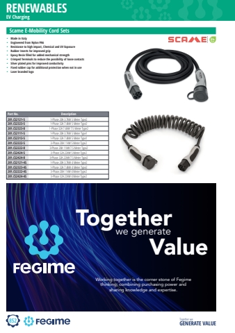 Together we GENERATE VALUERENEWABLES852EV Charging Scame E-Mobility Cord Sets%u2022 Made in Italy%u2022 Engineered from Nylon PA6%u2022 Resistance to high impact, Chemical and UV Exposure%u2022 Rubber Inserts for improved grip%u2022 Epoxy Resin filled for added mechanical strength%u2022 Crimped Terminals to reduce the possibility of loose contacts%u2022 Silver plated pins for improved conductivity%u2022 Fixed rubber cap for additional protection when not in use%u2022 Laser branded logoPart No. Description201.CS2121-5 1-Phase 20A 3.7kW 5 Meter Type2201.CS2323-5 1-Phase 32A 7.4kW 5 Meter Type2201.CS2323-8 1-Phase 32A 7.4kW 7.5 Meter Type2201.CS2111-5 1-Phase 20A 3.7kW 5 Meter Type1201.CS2313-5 1-Phase 32A 7.4kW 5 Meter Type1201.CS2222-5 3-Phase 20A 11kW 5 Meter Type2201.CS2222-8 3-Phase 20A 11kW 7.5 Meter Type2201.CS2424-5 3-Phase 32A 22kW 5 Meter Type2201.CS2424-8 3-Phase 32A 22kW 7.5 Meter Type2201.CS2121-4S 1-Phase 20A 3.7kW 4 Meter Type2201.CS2323-4S 1-Phase 32A 7.4kW 4 Meter Type2201.CS2222-4S 3-Phase 20A 11kW 4 Meter Type2201.CS2424-4S 3-Phase 32A 22kW 4 Meter Type2TogetherValuewe generateWorking together is the corner stone of Fegime thinking; combining purchasing power and sharing knowledge and expertise.