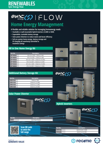 853 Together we GENERATE VALUERENEWABLESHybrid InvertersPart No. DescriptionSEFHI36G Hybrid Inverter 3.6kWSEFHI60G Hybrid Inverter 6kWSolar Power DiverterPart No. DescriptionSEFSD Solar Power DiverterHome Energy ManagementA flexible and reliable solution for managing homeenergy needs%u2022 Stackable or wall-mountable hybrid inverters (3.6kW or 6kW)%u2022 Expandable, stackable battery storage%u2022 Solar power diverters to reduce waste and boost efficiency%u2022 Full eco system home energy, battery storage andEV charging all seamlessly controlled to maximise savingsAdditional Battery Storage KitAll in One Home Energy KitScan QR code to view the full rangePart No. DescriptionSEF1A36G1 All In One 3.6kW + 1 Battery (5.1kW)SEF1A60G1 All In One 6kW + 1 Battery (5.1kW)SEF1A36G2 All In One 3.6kW + 2 Batteries (10.2kW)SEF1A60G2 All In One 6kW + 2 Batteries (10.2kW)SEF1A36G3 All In One 3.6kW + 3 Batteries (15.3kW)SEF1A60G3 All In One 6kW + 3 Batteries (15.3kW)Part No. DescriptionSEFB512G1 1 Battery (5.1kW)SEFB512G2 2 Batteries (10.2kW)SEFB512G3 3 Batteries (15.3kW)SEFB512G4 4 Batteries (20.4kW)Sync Energy Flow