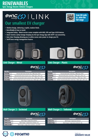 Together we GENERATE VALUERENEWABLES854Link Charger - Metal Link Charger - PlasticWall Charger 2 - Socketed Wall Charger 2 - TetheredOur smallest EV charger%u2022 Slimline Design, delivering a stylish, modern finish.%u2022 Retrofittable & Easy to install.%u2022 Integrated Safety - Metal version comes complete with MCB, SPD and Type A RCD devices.%u2022 Smart Control, easily manage charging via the Sync Energy App with OCPP 1.6J connectivity.%u2022 Auto Solar Charging allowing you to utilise excess solar power to charge your EV.%u2022 Tariff Sense energy management feature.Part No. DescriptionEVLR7MS Recessed with metal consumer unit, 7.4kW, Type 2, Wi-FiEVLR7MSG Recessed with metal consumer unit, 7.4kW, Type 2, Wi-Fi, 4GEVLS7MS Surface mounted with metal consumer unit, 7.4kW, Type 2, Wi-FiEVLS7MSG Surface mounted with metal consumer unit, 7.4kW, Type 2, Wi-Fi, 4GPart No. DescriptionEVLR7PS Recessed with plastic control box, 7.4kW, Type 2, Wi-FiEVLR7PSG Recessed with plastic control box, 7.4kW, Type 2, Wi-Fi, 4GEVLS7PS Surface mounted with plastic control box, 7.4kW, Type 2, Wi-FiEVLS7PSG Surface mounted with plastic control box, 7.4kW, Type 2, Wi-Fi, 4GPart No. DescriptionEVWC2S7G Wall Charger 2 single phase socketedEVWC2S7GG Wall Charger 2 single phase socketed + 4GEVWC2S7GGR Wall Charger 2 single phase socketed + 4G & RFIDPart No. DescriptionEVWC2T7G Wall Charger 2 single phase tetheredEVWC2T7GG Wall Charger 2 single phase tethered + 4GSync Energy Electric Vehicle ChargersScan QR code to view the full range