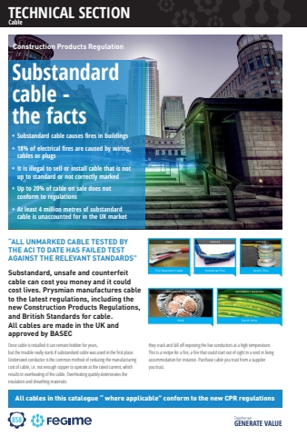 858 Together we GENERATE VALUEConstruction Products Regulation%u201cALL UNMARKED CABLE TESTED BY THE ACI TO DATE HAS FAILED TEST AGAINST THE RELEVANT STANDARDS%u201dOnce cable is installed it can remain hidden for years, but the trouble really starts if substandard cable was used in the first place. Undersized conductor is the common method of reducing the manufacturing cost of cable, i.e. not enough copper to operate at the rated current, which results in overheating of the cable. Overheating quickly deteriorates the insulation and sheathing materials: they crack and fall off exposing the live conductors at a high temperature. This is a recipe for a fire, a fire that could start out of sight in a void in living accommodation for instance. Purchase cable you trust from a supplier you trust.All cables in this catalogue %u201c where applicable%u201d conform to the new CPR regulationsSubstandard, unsafe and counterfeit cable can cost you money and it could cost lives. Prysmian manufactures cable to the latest regulations, including the new Construction Products Regulations, and British Standards for cable. All cables are made in the UK and approved by BASECSubstandard cable - the facts%u2022 Substandard cable causes fires in buildings%u2022 18% of electrical fires are caused by wiring, cables or plugs%u2022 It is illegal to sell or install cable that is not up to standard or not correctly marked%u2022 Up to 20% of cable on sale does not conform to regulations%u2022 At least 4 million metres of substandard cable is unaccounted for in the UK marketCableTECHNICAL SECTION