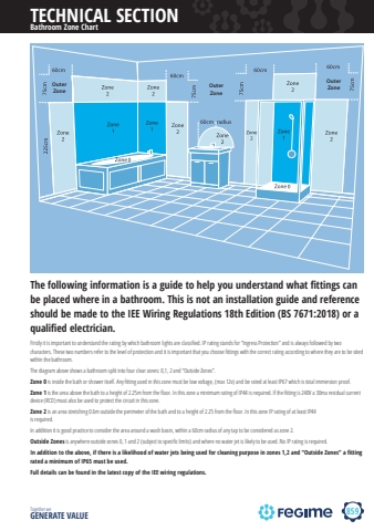 859 Together we GENERATE VALUEBathroom Zone ChartOuter Zone Outer ZoneOuter ZoneThe following information is a guide to help you understand what fittings can be placed where in a bathroom. This is not an installation guide and reference should be made to the IEE Wiring Regulations 18th Edition (BS 7671:2018) or a qualified electrician.Firstly it is important to understand the rating by which bathroom lights are classified. IP rating stands for %u201cIngress Protection%u201d and is always followed by two characters. These two numbers refer to the level of protection and it is important that you choose fittings with the correct rating according to where they are to be sited within the bathroom.The diagram above shows a bathroom split into four clear zones: 0,1, 2 and %u201cOutside Zones%u201d.Zone 0 is inside the bath or shower itself. Any fitting used in this zone must be low voltage, (max 12v) and be rated at least IP67 which is total immersion proof.Zone 1 is the area above the bath to a height of 2.25m from the floor. In this zone a minimum rating of IP44 is required. If the fitting is 240V a 30ma residual current device (RCD) must also be used to protect the circuit in this zone.Zone 2 is an area stretching 0.6m outside the perimeter of the bath and to a height of 2.25 from the floor. In this zone IP rating of at least IP44 is required.In addition it is good practice to consider the area around a wash basin, within a 60cm radius of any tap to be considered as zone 2.Outside Zones is anywhere outside zones 0, 1 and 2 (subject to specific limits) and where no water jet is likely to be used. No IP rating is required.In addition to the above, if there is a likelihood of water jets being used for cleaning purpose in zones 1,2 and %u201cOutside Zones%u201d a fitting rated a minimum of IP65 must be used.Full details can be found in the latest copy of the IEE wiring regulations.TECHNICAL SECTION