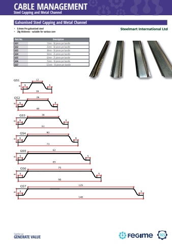 165CABLE MANAGEMENTTogether we GENERATE VALUEsteelmart international ltdSteel Capping and Metal ChannelGalvanised Steel Capping and Metal Channel%u2022 0.4mm Pre galvanised steel%u2022 28g thickness - suitable for various corePart No. DescriptionGS1 12mm - 50 pieces per bundleGS2 25mm - 50 pieces per bundleGS3 38mm - 50 pieces per bundleGS4 50mm - 25 pieces per bundleGS5 62mm - 25 pieces per bundleGS6 75mm - 10 pieces per bundleGS7 125mm - 10 pieces per bundle