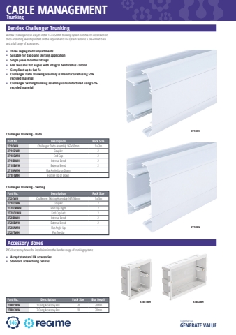 146CABLE MANAGEMENTTogether we GENERATE VALUETrunkingBendex Challenger TrunkingBendex Challenger is an easy to install 167 x 50mm trunking system suitable for installation at dado or skirting level dependent on the requirement. The system features a pre-drilled base and a full range of accessories.Part No. Description Pack SizeXT1CWH Challenger Dado Assembly 167x50mm 1 x 3mXT1COWH Coupler 2XT1ECWH End Cap 2XT1IBWH Internal Bend 2XT1EBWH External Bend 2XT1FAWH Flat Angle Up or Down 1XT1FTWH Flat tee Up or Down 1Accessory BoxesPart No. Description Pack Size Box DepthXTBB1WH 1 Gang Accessory Box 20 30mmXTBB2WH 2 Gang Accessory Box 10 30mmXT1CWHXT2CWHChallenger Trunking - DadoPart No. Description Pack SizeXT2CWH Challenger Skirting Assembly 167x50mm 1 x 3mXT1COWH Coupler 2XT2ECRWH End Cap Right 2XT2ECLWH End Cap Left 2XT2IBWH Internal Bend 2XT2EBWH External Bend 2XT2FAWH Flat Angle Up 1XT2FTWH Flat Tee Up 1Challenger Trunking - Skirting%u2022 Three segregated compartments%u2022 Suitable for dado and skirting application%u2022 Single piece moulded fittings%u2022 Flat tees and flat angles with integral bend radius control%u2022 Compliant up to Cat 7a%u2022 Challenger Dado trunking assembly is manufactured using 55% recycled material%u2022 Challenger Skirting trunking assembly is manufactured using 52% recycled materialPVC-U accessory boxes for installation into the Bendex range of trunking systems.%u2022 Accept standard UK accessories%u2022 Standard screw fixing centresXTBB1WH XTBB2WH