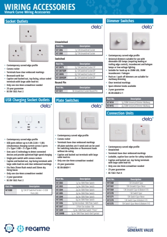 232WIRING ACCESSORIESTogether we GENERATE VALUEdetaVimark Curve Wiring AccessoriesSocket OutletsPart No. DescriptionVC1206 1g 13A Unswitched SocketVC1208 2g 13A Unswitched Socket%u2022 Contemporary curved edge profile%u2022 Convex rocker%u2022 Terminals have clear embossed markings%u2022 Recessed earth bar%u2022 Captive and backed out, top facing, colour coded terminals with large cable lead-ins%u2022 Only one size 4mm screwdriver needed%u2022 25-year guarantee%u2022 BS EN 1363: Part 2Part No. DescriptionVC1207S 1g 13A Switched Socket SPVC1207SDP 1g 13A Switched Socket DPVC1209S 2g 13A Switched Socket SPVC1209SDP 2g 13A Switched Socket DPUSB Charging Socket OutletsPart No. DescriptionVC1288 2g 13A SP Switched Socket + 3 USB Ports (4A)%u2022 Contemporary curved edge profile%u2022 USB ports deliver up to 4.0A (3.0A + 1.0A) simultaneous charging current across 3 ports (1 x Type C USB + 2 x Type A USB)%u2022 Uses auto IC technology to detect connected devices and provide optimised high-speed charging%u2022 Single pole switch with convex rockers%u2022 Captive and backed out, top facing terminals with large cable lead-ins and clear embossed markings%u2022 Fits Deta 25mm flush metal and 35mm dry lining boxes%u2022 Only one size 4mm screwdriver needed%u2022 2-year guarantee%u2022 BS EN 1363: Part 2Part No. DescriptionVC1331 5A Unswitched Socket Round PinPlate SwitchesPart No. DescriptionVC1202 1g 1w 10AX Plate SwitchVC1203 1g 2w 10AX Plate SwitchVC1204 2g 2w 10AX Plate SwitchVC1205 3g 2w 10AX Plate SwitchVC1244 4g 2w 10AX Plate SwitchVC1245 6g 2w 10AX Plate SwitchVC1246 1g Intermediate 10AX Plate SwitchVC1247 3 Pole Fan Isolator 10AVC1249 1g 2w 10AX Plate Switch \VC1249B 1g 2w 10AX Plate Switch Bell Symbol%u2022 Contemporary curved edge profile%u2022 Convex rocker%u2022 Terminals have clear embossed markings%u2022 All plate switches are X-rated and can be used for switching inductive or fluorescent loads without de-rating%u2022 Captive and backed out terminals with large cable lead-ins%u2022 Only one size 4mm screwdriver needed%u2022 25-year guarantee%u2022 BS EN 60669-1Dimmer SwitchesPart No. DescriptionVC1414 1g 250W Universal Dimmer MultiwayVC1415 2g 250W Universal Dimmer Multiway%u2022 Contemporary curved edge profile%u2022 Universal dimmers suitable for use with dimmable LED lamps (requiring leading or trailing edge control), incandescent and halogen lamps or low voltage lighting%u2022 Suitable for loads up to 250W LED, 350W incandescent / halogen%u2022 Push on / push off dimmers are suitable for multiway dimming%u2022 Clear terminal markings%u2022 Spare dimmer knobs available%u2022 2-year guarantee%u2022 BS EN 60669-2-1UnswitchedSwitchedRound PinConnection UnitsPart No. DescriptionVC1360 13A Unswitch SpurVC1361 13A Unswitch Spur NeonVC1364 13A Unswitch Spur & Bottom F/OVC1370 13A Switch SpurVC1371 13A Switch Spur NeonVC1374 13A Switch Spur & Bottom F/OVC1375 13A Switch Spur Neon & Bottom F/O%u2022 Contemporary curved edge profile%u2022 Unswitched%u2022 Terminals have clear embossed markings%u2022 Lockable, captive fuse carrier for safety isolation%u2022 Captive and backed out, top facing terminals with large cable lead-ins%u2022 Only one size 4mm screwdriver needed%u2022 25-year guarantee%u2022 BS 1363: Part 4