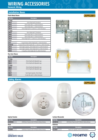 241WIRING ACCESSORIESTogether we GENERATE VALUEapplebyDomestic WiringInstallation BoxesSafety AlarmsPart No. Description1 GangSB623 16mm Depth with 4 KnockoutsSB655 25mm Depth with 12 x 20mm KnockoutsSB615 35mm Depth with 12 x 20mm KnockoutsSB618 47mm Depth with 10 x 20mm & 2 x 25mm Knockouts2 GangSB633 16mm Depth with 13 KnockoutsSB665 25mm Depth with 16 x 20mm KnockoutsSB625 35mm Depth with 16 x 20mm KnockoutsSB628 47mm Depth with 12 x 20mm & 4 x 25mm KnockoutsOther9257 1 Gang Architrave 28mm Depth with 2 x 16mm Knockouts9258/GV 2 Gang Architrave 28mm Depth with 2 x 16mm & 2 x 20mm KnockoutsSB676 Dual Single Gang Box, 25mm Depth with 16 x 20mm KnockoutsSB636 Dual Single Gang Box, 35mm Depth with 16 x 20mm KnockoutsSB646 3 Gang Box, 35mm Depth with 18 x 20mm KnockoutsFlush Metal BoxesPart No. Description1 GangSB619 35mm Depth with Adjustable LugsSB632 47mm Depth with Adjustable Lugs2 GangSB629 35mm Depth with Adjustable LugsSB631 47mm Depth with Adjustable LugsOtherSB637 Dual Single Gang Box, 35mm DepthSB639 Circular Box with 2 x 20mm KnockoutsDry Liner BoxesPart No. DescriptionD230OSA 230V Mains Powered with 9V Alkaline Battery BackupOptical SmokePart No. DescriptionD230HA 230V Mains Powered with 9V Alkaline Battery BackupHeatPart No. DescriptionD230COA 230V Mains Powered with 9V Alkaline Battery BackupCarbon MonoxidePart No. DescriptionD230UP Pattress for Appleby Smoke and Heat AlarmsPattress