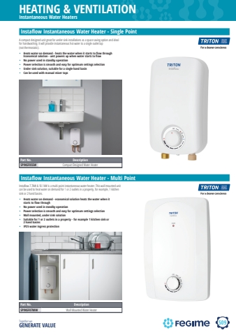 509HEATING & VENTILATIONTogether we GENERATE VALUEInstantaneous Water Heaters%u2022 Heats water on demand - heats the water when it starts to flow through Economical solution - unit powers up when water starts to flow%u2022 No power used in standby operation%u2022 Power selection is smooth and easy for optimum settings selection%u2022 Under sink solution, suitable for a single hand basin%u2022 Can be used with manual mixer tapsInstaflow Instantaneous Water Heater - Single PointA compact designed unit great for under sink installations as a space saving option and ideal for handwashing. It will provide instantaneous hot water to a single outlet tap (not thermostatic).Part No. DescriptionSPINSF05SW Compact Designed Water Heater%u2022 Heats water on demand - economical solution heats the water when it starts to flow through%u2022 No power used in standby operation%u2022 Power selection is smooth and easy for optimum settings selection%u2022 Wall mounted, under sink solution%u2022 Suitable for 1 or 2 outlets in a property - for example 1 kitchen sink or 2 hand basins%u2022 IP25 water ingress protectionInstaflow Instantaneous Water Heater - Multi PointInstaflow 7.7kW & 10.1kW is a multi point instantaneous water heater. This wall mounted unit can be used to heat water on demand for 1 or 2 outlets in a property, for example, 1 kitchen sink or 2 hand basins.Part No. DescriptionSPINSF07MW Wall Mounted Water Heater