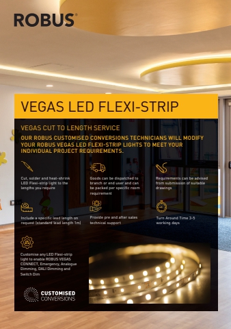 vegas led flexi-strip VEGAS LED FLEXI-STRIPVEGAS CUT TO LENGTH SERVICEOUR ROBUS CUSTOMISED CONVERSIONS TECHNICIANS WILL MODIFY YOUR ROBUS VEGAS LED FLEXI-STRIP LIGHTS TO MEET YOUR INDIVIDUAL PROJECT REQUIREMENTS. Cut, solder and heat-shrink LED Flexi-strip light to the lengths you requireGoods can be dispatched to branch or end user and can be packed per specific room requirementInclude a specific lead length on request (standard lead length 1m)Requirements can be advised from submission of suitable drawingsTurn Around Time 3-5 working daysProvide pre and after sales technical supportCustomise any LED Flexi-strip light to enable ROBUS VEGAS CONNECT, Emergency, Analogue Dimming, DALI Dimming and Switch Dim