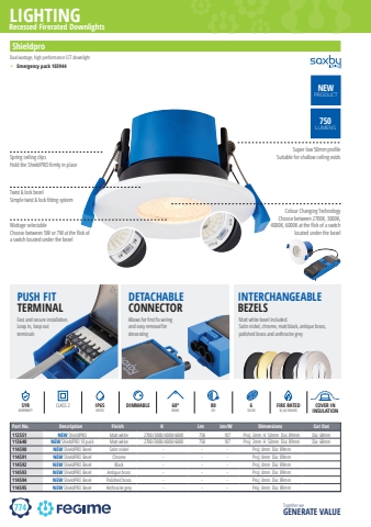774LIGHTINGTogether we GENERATE VALUE750LUMENSShieldproPart No. Description Finish K Lm Lm/W Dimensions Cut Out112551 NEW ShieldPRO Matt white 2700/3000/4000/6000 750 107 Proj: 3mm H: 50mm Dia: 89mm Dia: 68mm113640 NEW ShieldPRO 10 pack Matt white 2700/3000/4000/6000 750 107 Proj: 3mm H: 50mm Dia: 89mm Dia: 68mm114590 NEW ShieldPRO Bezel Satin nickel - - - Proj: 4mm Dia: 89mm 114591 NEW ShieldPRO Bezel Chrome - - - Proj: 4mm Dia: 89mm 114592 NEW ShieldPRO Bezel Black - - - Proj: 4mm Dia: 89mm 114593 NEW ShieldPRO Bezel Antique brass - - - Proj: 4mm Dia: 89mm 114594 NEW ShieldPRO Bezel Polished brass - - - Proj: 4mm Dia: 89mm 114595 NEW ShieldPRO Bezel Anthracite grey - - - Proj: 4mm Dia: 89mm Recessed Firerated DownlightsSuper low 50mm profi leSuitable for shallow ceiling voidsColour Changing TechnologyChoose between 2700K, 3000K, 4000K, 6000K at the fl ick of a switch located under the bezelSpring ceiling clipsHold the ShieldPRO fi rmly in placeTwist & lock bezelSimple twist & lock fi tting systemWattage selectableChoose between 5W or 7W at the fl ick of a switch located under the bezelNEWPRODUCTDETACHABLECONNECTORAllows for fi rst fi x wiring and easy removal for decoratingPUSH FITTERMINALINTERCHANGEABLEBEZELSFast and secure installation. Loop in, loop out terminalsMatt white bezel included.Satin nickel, chrome, matt black, antique brass, polished brass and anthracite greyDual wattage, high performance CCT downlight%u2022 Emergency pack 1039445YRWARRANTY80CRI IP65RATED 6SDCM60%u00baBEAMCLASS 2 DIMMABLE FIRE RATED30,60,90MINSCOVER ININSULATION