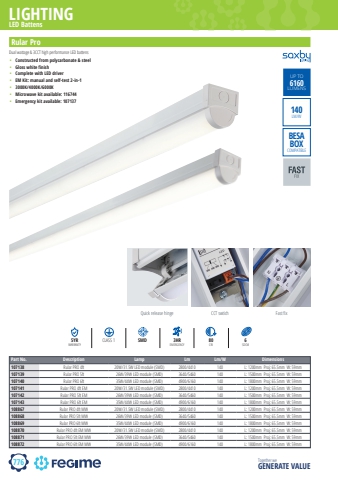 776LIGHTINGTogether we GENERATE VALUELED BattensQuick release hinge CCT swtich Fast fi xRular ProDual wattage & 3CCT high performance LED battens%u2022 Constructed from polycarbonate & steel %u2022 G loss white finish%u2022 Complete with LED driver%u2022 EM Kit: manual and self-test 2-in-1%u2022 3000K/4000K/6000K%u2022 Microwave kit available: 116744%u2022 Emergency kit available: 107137Part No. Description Lamp Lm Lm/W Dimensions107138 Rular PRO 4ft 20W/31.5W LED module (SMD) 2800/4410 140 L: 1200mm Proj: 65.5mm W: 59mm 107139 Rular PRO 5ft 26W/39W LED module (SMD) 3640/5460 140 L: 1500mm Proj: 65.5mm W: 59mm 107140 Rular PRO 6ft 35W/44W LED module (SMD) 4900/6160 140 L: 1800mm Proj: 65.5mm W: 59mm 107141 Rular PRO 4ft EM 20W/31.5W LED module (SMD) 2800/4410 140 L: 1200mm Proj: 65.5mm W: 59mm 107142 Rular PRO 5ft EM 26W/39W LED module (SMD) 3640/5460 140 L: 1500mm Proj: 65.5mm W: 59mm 107143 Rular PRO 6ft EM 35W/44W LED module (SMD) 4900/6160 140 L: 1800mm Proj: 65.5mm W: 59mm 108867 Rular PRO 4ft MW 20W/31.5W LED module (SMD) 2800/4410 140 L: 1200mm Proj: 65.5mm W: 59mm 108868 Rular PRO 5ft MW 26W/39W LED module (SMD) 3640/5460 140 L: 1500mm Proj: 65.5mm W: 59mm 108869 Rular PRO 6ft MW 35W/44W LED module (SMD) 4900/6160 140 L: 1800mm Proj: 65.5mm W: 59mm 108870 Rular PRO 4ft EM MW 20W/31.5W LED module (SMD) 2800/4410 140 L: 1200mm Proj: 65.5mm W: 59mm 108871 Rular PRO 5ft EM MW 26W/39W LED module (SMD) 3640/5460 140 L: 1500mm Proj: 65.5mm W: 59mm 108872 Rular PRO 6ft EM MW 35W/44W LED module (SMD) 4900/6160 140 L: 1800mm Proj: 65.5mm W: 59mm 5YRWARRANTY80CRI SMD 6SDCMCLASS 1 3HREMERGENCY140LM/WUP TO 6160LUMENSBESA BOXCOMPATIBLE