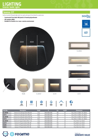 778LIGHTINGTogether we GENERATE VALUEExterior Guide Lights61219 612116121495285 EL-40107EL-40103EL-401043000K 4000K 6000K Severus CCTSurface mounted LED guide lights which are quick and easy to fi t and ideal for coastal areas%u2022 Constructed from black ABS plastic & frosted polycarbonate%u2022 LED module (SMD)%u2022 Suitable for location in or near a marine environmentPart No. Description Finish K Lm Lm/W Dimensions EL-40103 Severus CCT Landscape Direct IP65 3W Grey 3000/4000/6000 180 60 Proj: 27mm H: 80mm W: 230mm 61211 Severus CCT Landscape Direct IP65 3W Black 3000/4000/6000 180 60 Proj: 27mm H: 80mm W: 230mm EL-40104 Severus CCT Landscape Indirect IP65 2W Grey 3000/4000/6000 65 33 Proj: 27mm H: 80mm W: 230mm 61214 Severus CCT Landscape Indirect IP65 2W Black 3000/4000/6000 100 50 Proj: 28mm H: 80mm W: 230mm EL-40107 Severus CCT Square Indirect IP65 1.1W Grey 3000/4000/6000 42 38 Proj: 27mm Sq: 125mm 61219 Severus CCT Square Indirect IP65 3W Black 3000/4000/6000 150 50 Proj: 28mm Sq: 125mm 95285 Severus CCT Round Indirect IP65 3W Grey 3000/4000/6000 120 40 Proj: 33mm Dia: 135mm99545 Severus CCT Round Indirect IP65 3W Black 3000/4000/6000 120 40 Proj: 33mm Dia: 135mmCCTUP TO 180LUMENS3YRWARRANTY80CRI SMD 120%u00baBEAM CLASS 2 IP65RATED
