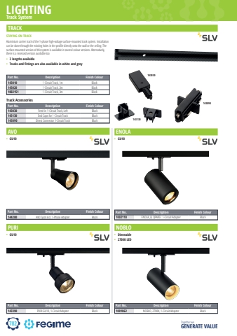 782LIGHTINGTogether we GENERATE VALUETrack SystemTRACKSTAYING ON TRACKAluminium carrier track of the 1-phase high-voltage surface-mounted track system. Installation can be done through the existing holes in the profi le directly onto the wall or the ceiling. The surface-mounted version of this system is available in several colour versions. Alternatively, there is a recessed version available too%u2022 3 lengths available%u2022 Tracks and fittings are also available in white and grey Part No. Description Finish Colour143010 1-Circuit Track, 1m Black143020 1-Circuit Track, 2m Black1002151 1-Circuit Track, 3m BlackTrack AccessoriesPart No. Description Finish Colour143030 Feed-in 1-Circuit Track, Left Black143130 End Caps for 1-Circuit Track Black143090 Direct Connector 1-Circuit Track Black143030143130143090AVO%u2022 GU10Part No. Description Finish Colour144200 AVO Spot incl. 1-Phase Adapter BlackENOLA%u2022 GU10Part No. Description Finish Colour1002110 ENOLA_B, QPAR51 1-Circuit Adapter BlackPURI%u2022 GU10Part No. Description Finish Colour143390 PURI GU10, 1-Circuit Adapter BlackNOBLO%u2022 Dimmable%u2022 2700K LEDPart No. Description Finish Colour1001862 NOBLO, 2700K, 1-Circuit Adapter Black