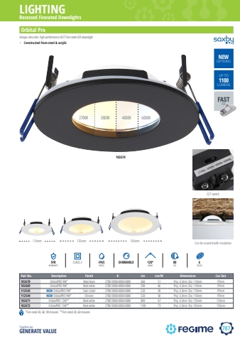 787LIGHTINGTogether we GENERATE VALUERecessed Firerated DownlightsCan be covered with insulationCCT switch110mm 135mm 165mm1026702700K 3000K 4000K 6000KUP TO 1100LUMENSOrbital ProNEWOPTIONSUnique ultra slim, high performance 4CCT fire rated LED downlight%u2022 Constructed from steel & acrylicPart No. Description Finish K Lm Lm/W Dimensions Cut Out102670 OrbitalPRO 9W* Matt black 2700/3000/4000/6000 460 51 Proj: 4.3mm Dia: 110mm 97mm102669 OrbitalPRO 9W* Matt white 2700/3000/4000/6000 590 66 Proj: 4.3mm Dia: 110mm 97mm112543 NEW OrbitalPRO 9W* Satin nickel 2700/3000/4000/6000 520 58 Proj: 4.3mm Dia: 110mm 97mm112544 NEW OrbitalPRO 9W* Chrome 2700/3000/4000/6000 520 58 Proj: 4.3mm Dia: 110mm 97mm102671 OrbitalPRO 12W** Matt white 2700/3000/4000/6000 800 67 Proj: 4.3mm Dia: 135mm 125mm102672 OrbitalPRO 15W** Matt white 2700/3000/4000/6000 1100 73 Proj: 4.3mm Dia: 165mm 155mm*Fire rated 30, 60, 90 minutes **Fire rated 30, 60 minutes 5YRWARRANTY80CRI IP65RATED 6SDCM120%u00baBEAMCLASS 2 DIMMABLE