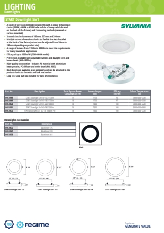 790LIGHTINGTogether we GENERATE VALUESTART Downlight 5in1%u2022 A range of 5in1 non dimmable downlights with 3 colour temperature choice (3000K, 4000K or 6500K selected via a 3-way switch located on the back of the fixture) and 2 mounting methods (recessed or surface mounted)%u2022 3 round sizes in diameters of 165mm, 227mm and 290mm%u2022 Multiple cut-out dimensions thanks to flexible brackets installed at the back of the fixture (cut-out can be adjusted from 50mm to 260mm depending on product size)%u2022 A range of lumens from 1150lm to 2300lm to meet the requirements for many household applications%u2022 Efficacy of up to 100lm/W (23W 4000K model)%u2022 PIR version available with adjustable lumens and daylight level and lumen levels (900-1800lm)%u2022 High-quality construction - includes PC material with aluminium heat spreader, PC diffuser and white bezel (RAL 9003)%u2022 Black bezels are available as an accessory and can be attached to the product thanks to the twist and lock mechanism%u2022 Loop-in / Loop-out box included for ease of installationPart No. Description Total System Power Consumption (W)Lumen Output (lm)Effi cacy (lm/W)Colour Temperature (K)0053148 START Downlight 5in1 50-125 1150lm 12 1150 96 3000-4000-65000053149 START Downlight 5in1 65-185 1750lm 18 1750 97 3000-4000-65000053150 START Downlight 5in1 65-260 1800lm 18 1800 100 3000-4000-65000053151 START Downlight 5in1 65-260 2300lm 23 2300 100 3000-4000-65000053152 START Downlight 5in1 65-185 1800lm PIR 18 1800 100 3000-4000-6500Downlights AccessoriesPart No. Description0053156 Black Bezel 1760053157 Black Bezel 2280053158 Black Bezel 301BlackDownlightsSTART Downlight 5in1 125 START Downlight 5in1 185 START Downlight 5in1 185 PIR START Downlight 5in1 260