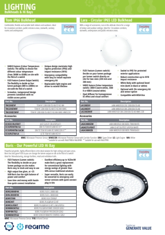 796LIGHTINGTogether we GENERATE VALUEBulkheads & Hi BaysLara - Circular IP65 LED BulkheadWith a range of accessories, Lara is the ultimate choice for a range of indoor and outdoor settings. Ideal for: Circulation corridors, stairwells, underpasses and public entrance areas.%u2022 FLEX Feature (Lumen switch): Decide on your lumen package per lumen switch directly on site for two sizes (250 mm and 300 mm)%u2022 VARIO Feature (Colour temperature switch): 3000 K (warm white), 3500 K or 4000 K (neutral white)%u2022 Opal diffuser for homogeneous lit effect and visual comfort%u2022 Sealed to IP65 for protected exterior applications%u2022 Robust construction up to IK10 impact resistance%u2022 White Body with optional bezel trim (both in black or white)%u2022 Optional with 3hr emergency kit and sensor option%u2022 Compatible with BESA BoxPart No. DescriptionLASA300BEZW LARA VARIOFLEX 300 BEZEL TRIM WHITELASAE3TLIFEKIT LARA E3 KIT SELFTEST LIFEPO4 WHITELASA300BEZB LARA VARIOFLEX 300 BEZEL TRIM BLACKAccessoriesPart No. DescriptionLA1200ZVF LARA VARIOFLEX 250 1200 830/35/40LA2200ZVF LARA VARIOFLEX 300 2200 830/35/40LA2200ZMVF LARA VARIOFLEX 300 2200 830/35/40 MWS CORTom IP66 BulkheadComfortable, fl exible and variable both indoors and outdoors. Ideal for circulation corridors, public entrance areas, stairwells, sanitary rooms and underpasses%u2022 VARIO Feature (Colour Temperature Switch): The ability to choose five different colour temperature (from 3000K to 6500k) on site with the flick of a switch%u2022 FLEX Feature (Lumen Output Switch): The flexibility to decide on four lumen packages (800 to 2200lm) on site with the flick of a switch%u2022 Screwless, tamperproof design prevents vandalism with no visible access points%u2022 Unique design maintains high ingress protection (IP66) and impact resistance (IK10)%u2022 Emergency compatibility with easy to install separate emergency kit%u2022 Replaceable light engine and driver to extend lifetimeMWS: Microwave Presence Sensor MWSCOR: Microwave Presence Sensor with Corridor Function DRV: Spare Driver LE: Light Engine WH: White * Suitable for use with 96637988 & 96638989 ** Suitable for use with 96637990Part No. DescriptionTM2200ZVF TOM VF 2200 830/35/40/57/65 WH TM2200ZMVF TOM VF 2200 830/35/40/57/65 WH MWS TM2200ZCMVF TOM VF 2200 830/35/40/57/65 WH MWS MWSCORAccessoriesPart No. DescriptionECOE3CIRLIFEKIT JUST E3/E3T CIR LIFEPO4 F1 ECOSPDRVTM/LA DRV TE TOM VF/LARA VF2 V1* ECOSPDRVTM/LACM DRV TE TOM VF/LARA VF2 MWSCOR V1** ECOSPLETM/LA LE TE TOM VF/LARA VF2 V1 Boris - Our Powerful LED Hi BayPowerful yet gentle, highly effi cient Boris is the ideal solution for high ceilings and open areas. Boris has also gone FLEX so you can change the lumen output on site at the fl ick of a switch! Ideal for: Manufacturing, storage facilities, retail and exhibition halls.Part No. DescriptionBORS20000F4K BORIS FLEX S 20000 840BORL30000F4K BORIS FLEX L 30000 840BORFSTIRR BORIS FLEX STIRRUPBORE3KIT BORIS PLUG&PLAY E3 KITBORE3LIFEKIT BORIS PLUG&PLAY E3 KIT 5.5W LIFEPO4BORMWSKITG2 BORIS PLUG&PLAY MWS SENSOR GEN2BORPIRKITG2 BORIS PLUG&PLAY PIR SENSOR GEN2BORREMOTEG2 BORIS SENSOR REMOTE CONTROL GEN2MWS: Microwave Presence Sensor PIR: Infrared Sensor%u2022 FLEX Feature (Lumen switch): The flexibility to decide on your lumen package on site makes Boris easy to stock and easy to use%u2022 High output low glare, at <25 UGR Boris has the right balance of power and comfort%u2022 Save time and money with hassle free quick connect installation%u2022 Excellent efficiency up to 162lm/W make Boris a great replacement for conventional lighting with energy savings of greater than 50% versus traditional solutions%u2022 Super versatile, Boris can easily be converted to emergency and sensor versions with quick connect plug in kits