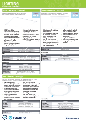 798LIGHTINGTogether we GENERATE VALUELED Panels & DownlightsAnna %u2013 Recessed LED Panel%u2022 VARIO Feature (Colour Temperature Switch): The ability to choose your colour temperature on site with the flick of a switch%u2022 FLEX Feature (Lumen Output Switch): The flexibility to decide on your lumen package on site with the flick of a switch%u2022 JUST %u2013 adapt on-site to an emergency version using the Just Emergency Plug&Play kit%u2022 Integrated self-test emergency indicator with the JUST E3 self-test kit%u2022 Energy efficient with 125 lm/W%u2022 Gentle, soft and glare free lighting (UGR <19)%u2022 Direct replacement for 4x14 W T5 or 4x18 W T8 fluorescent panelsProviding high quality light with low glare and high effi ciency! Ideal for: Schools/universities, offi ces and meeting roomsMaya - Recessed LED Panel%u2022 1:1 replacement for traditional office luminaire%u2022 Direct replacement for 4 x 14w T5 or 4x18w T8 fluorescent%u2022 Gentle, soft and glare free lighting with UGR<19%u2022 Easy and quick installation thanks to a connector box with a 4-pole piano-key connector (for up to 2.5mm%u00b2 wires) enabling loop-in loop-out wiring%u2022 Surface mounting is optional using the THORNeco Surface Mount Kit (separately available)%u2022 Safety wire kit is available as optional extra%u2022 Long lifetime L70 50 000 h%u2022 Compatible with the PLUG&PLAY Emergency kit (separately available)AccessoriesUniform, glare-free illumination make Maya ideal for cost-eff ective refurbishments. Ideal for: Offi ce, school, library and shops.Part No. DescriptionAN4400VF26X6 ANNA VARIOFLEX 2 Q596 4400 830/35/40AN4400VF212X3 ANNA VARIOFLEX 2 12X3 4400 830/35/40DALIPart No. DescriptionAN4400XVF26X6 ANNA VARIOFLEX 2 Q596 4400 830/35/40 DALI AAN4400XVF212X3 ANNA VARIOFLEX 2 12X3 4400 830/35/40 DALIPart No. DescriptionANVF2PBSPRING TECO ANNA V RECESSED SPRINGSECOSURBOX TECO SURFACE MOUNT BOX Q596ECO12X3SURBOX TECO SURFACE MOUNT BOX 12X3ECOE3TLIFEKIT JUST E3 PLUG&PLAY KIT SELF TEST LiFePO4ECOE3MLIFEKIT JUST E3 PLUG&PLAY KIT MANUAL TEST LiFePO4AccessoriesPart No. DescriptionMY3500Z4K6X6 MAYA Q596 3500 840Part No. DescriptionMYSAFEKIT TECO MAYA SAFETY KITECOSURBOX TECO SURFACE MOUNT BOX Q596ECOE3MLIFEKIT JUST E3 PLUG&PLAY KIT MANUAL TEST LiFePO4Zoe - Slim LED DownlightSlim, fl exible and comfortable, Zoe is ideal for your everyday needs. Ideal for: Circulation corridors, reception areas, schools/universities and offi ce/meeting rooms.%u2022 VARIO Feature (Colour Temperature Switch): The ability to choose your colour temperature on site with the flick of a switch%u2022 FLEX Feature (Lumen Output Switch): The flexibility to decide on your lumen package on site with the flick of a switch%u2022 Prismatic diffuser improves perceived glare%u2022 The slimline profile of 27 mm fits most ceiling types%u2022 Easy, quick and tool-free installation thanks to an integrated connector with a 4-pole push terminal (for up to 2.5 mm2 wires) enabling loop-in loopout wiring%u2022 The 200 mm version with DALI driver allows for complete dimmability%u2022 JUST: adapt on-site to an emergency version using the Just Emergency PLUG&PLAY kitPart No. DescriptionZO700ZVF ZOE VARIOFLEX 130 700 830/35/40ZO1000ZVF ZOE VARIOFLEX 165 1000 830/35/40ZO2000ZVF ZOE VARIOFLEX 200 2000 830/35/40Part No. DescriptionZOSURBOX ZOE VARIO 200 2000 830/835/840DALIPart No. DescriptionZOSURBOX ZOE VARIO 210 SURFACE MOUNT BOXECOE3MLIFEKIT Just E3 PLUG&PLAY Kit ManualTest LiFePO4ECOE3TLIFEKIT Just E3 Plug&Play Kit SelfTest LiFePo4- Replacement Battery for 96634428Accessories