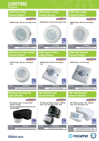801LIGHTINGTogether we GENERATE VALUEPIR Sensors250W Flush Ceiling Presence Detector%u2022 250W LED rated - 360%u00b0 up to 8m range at 2.5m250W Surface Ceiling Presence Detector%u2022 250W LED rated - 360%u00b0 up to 8m range at 2.5m420W Flush Ceiling Presence Detector%u2022 420W LED rated - 360%u00b0 up to 10m range at 2.5m420W Round Surface Ceiling Presence Detector420W Square Surface Ceiling Detector 420W Wall Mounted Presence DetectorMultiway Mounting PIR Light Controller Part No. DescriptionMLSA360NP Multiway Mounting PIR Light Controller200%u00ba Wall Mounted External Detector180%u00ba Wall Mounted External DetectorsPart No. DescriptionMLB3000 Wall Mounted External DetectorPart No. DescriptionSLB2300 Wall Mounted External Detector - BlackSLW2300 Wall Mounted External Detector - WhitePart No. DescriptionPDRS1500N Round Surface Ceiling Presence DetectorPart No. DescriptionPDSM1500 Square Surface Ceiling Detector Part No. DescriptionPDWM1500 Wall Mounted Presence DetectorPart No. DescriptionSLFM360N Flush Ceiling Presence DetectorPart No. DescriptionSLW360N Surface Ceiling Presence DetectorPart No. DescriptionPDFM1500N Flush Ceiling Presence Detector%u2022 420W LED rated - 360%u00b0 up to 10m range at 2.5m%u2022 420W LED rated - 360%u00b0 up to 10m range at 2.5m%u2022 420W LED rated - 120%u00b0 10m range%u2022 200%u00b0 Night Eye PIR light controller - 140W LED rated - up to 12m range at 2.5m - black%u2022 180%u00b0 PIR light controller - IP55 - 250W LED rated - up to 12m range at 2.5m%u2022 200%u00b0 detection angle / 12 meters frontal detection coverage%u2022 360%u00b0 Anti-creep detection %u00d8 5 meters at 2.5m mounting height