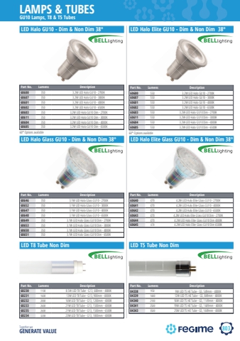 803LAMPS & TUBESTogether we GENERATE VALUEGU10 Lamps, T8 & T5 Tubesbell lighting belllightingLED Halo GU10 - Dim & Non Dim 38%u00b0Part No. Lumens Description60600 350 3.2W LED Halo GU10 - 2700K60607 350 3.2W LED Halo GU10 - 3000K60601 350 3.2W LED Halo GU10 - 4000K60602 350 3.2W LED Halo GU10 - 6500K60603 350 3.2W LED Halo GU10 Dim - 2700K60611 350 3.2W LED Halo GU10 Dim - 3000K60604 350 3.2W LED Halo GU10 Dim - 4000K60605 350 3.2W LED Halo GU10 Dim - 6500Kbell lighting belllightingLED Halo Elite GU10 - Dim & Non Dim 38%u00b0Part No. Lumens Description60600 550 3.2W LED Halo GU10 - 2700K60607 550 3.2W LED Halo GU10 - 3000K60601 550 3.2W LED Halo GU10 - 4000K60602 550 3.2W LED Halo GU10 - 6500K60603 550 3.2W LED Halo GU10 Dim - 2700K60611 550 3.2W LED Halo GU10 Dim - 3000K60604 550 3.2W LED Halo GU10 Dim - 4000K60605 550 3.2W LED Halo GU10 Dim - 6500Kbell lighting belllightingLED Halo Elite Glass GU10 - Dim & Non Dim 38%u00b0 Part No. Lumens Description60640 470 4.2W LED Halo Elite Glass GU10 - 2700K60641 470 4.2W LED Halo Elite Glass GU10 - 4000K60642 470 4.2W LED Halo Elite Glass GU10 - 6500K60643 470 4.2W LED Halo Elite Glass GU10 Dim - 2700K60644 470 4.2W LED Halo Elite Glass GU10 Dim 4000K60645 470 4.2W LED Halo Elite Glass GU10 Dim 6500Kbell lighting belllightingLED T8 Tube Non DimPart No. Lumens Description60230 1100 8.5W LED T8 Tube - G13, 600mm - 4000K60231 1600 13W LED T8 Tube - G13, 900mm - 4000K60232 2000 16W LED T8 Tube - G13, 1200mm - 4000K60233 2600 21W LED T8 Tube - G13, 1500mm - 4000K60235 2600 21W LED T8 Tube - G13, 1500mm - 6500K60234 3200 23W LED T8 Tube - G13, 1800mm - 4000Kbell lighting belllightingLED Halo Glass GU10 - Dim & Non Dim 38%u00b0Part No. Lumens Description60646 350 3.1W LED Halo Glass GU10 - 2700K60652 350 3.1W LED Halo Glass GU10 - 3000K60647 350 3.1W LED Halo Glass GU10 - 4000K60648 350 3.1W LED Halo Glass GU10 - 6500K60649 350 3.1W LED Halo Glass GU10 Dim - 2700K60653 350 3.1W LED Halo Glass GU10 Dim - 3000K60650 350 3.1W LED Halo Glass GU10 Dim - 4000K60651 350 3.1W LED Halo Glass GU10 Dim - 6500Kbell lighting belllightingLED T5 Tube Non DimPart No. Lumens Description04338 950 9W LED T5 HE Tube - G5, 549mm - 4000K04339 1440 12W LED T5 HE Tube - G5, 849mm - 4000K04340 2100 16W LED T5 HE Tube - G5, 1149mm - 4000K04341 2500 19W LED T5 HE Tube - G5, 1449mm - 4000K04343 3500 25W LED T5 HO Tube - G5, 1449mm - 4000K60%u00b0 Options available 60%u00b0 Options available