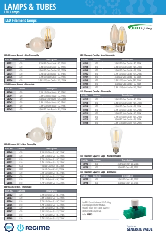 804LAMPS & TUBESTogether we GENERATE VALUELED LampsLED Filament LampsUse BELL Smart Universal LED Trailing/Leading Edge Dimmer Module.Smooth, fl icker free, silent, buzz free dimming and easy set up.Code: 10803LED Filament Candle - Non DimmablePart No. Lumens Description60703 470 3.3W LED Clear Candle - BC, 2700K60704 470 3.3W LED Clear Candle - SBC, 2700K60705 470 3.3W LED Clear Candle - ES, 2700K60706 470 3.3W LED Clear Candle - SES, 2700K60707 470 3.3W LED Satin Candle - BC, 2700K60708 470 3.3W LED Satin Candle, SBC, 2700K60709 470 3.3W LED Satin Candle - ES, 2700K60710 470 3.3W LED Satin Candle - SES, 2700Kbell lighting belllightingLED Filament Candle - DimmablePart No. Lumens Description60717 470 3.3W LED Clear Candle - BC, 2700K60718 470 3.3W LED Clear Candle - SBC, 2700K60719 470 3.3W LED Clear Candle - ES, 2700K60720 470 3.3W LED Clear Candle - SES, 2700K60721 470 3.3W LED Satin Candle - BC, 2700K60722 470 3.3W LED Satin Candle - SBC, 2700K60723 470 3.3W LED Satin Candle - ES, 2700K60724 470 3.3W LED Satin Candle - SES, 2700KLED Filament Round - Non DimmablePart No. Lumens Description60731 470 3.3W LED Clear Candle - BC, 2700K60732 470 3.3W LED Clear Candle - ES, 2700K60733 470 3.3W LED Clear Candle - SES, 2700K60734 470 3.3W LED Satin Candle - BC, 2700K60735 470 3.3W LED Satin Candle - ES, 2700K60736 470 3.3W LED Satin Candle - SES, 2700KLED Filament Round - DimmablePart No. Lumens Description60740 470 3.3W LED Clear Round - BC, 2700K60741 470 3.3W LED Clear Round - ES, 2700K60742 470 3.3W LED Clear Round - SES, 2700K60743 470 3.3W LED Satin Round - BC, 2700K60744 470 3.3W LED Satin Round - ES, 2700K60745 470 3.3W LED Satin Round - SES, 2700KLED Filament GLS - Non DimmablePart No. Lumens Description60749 470 3.3W LED Clear GLS - BC, 2700K60750 470 3.3W LED Clear GLS - ES, 2700K60751 810 5.7W LED Clear GLS - BC, 2700K60752 810 5.7W LED Clear GLS - ES, 2700K60823 1550 11W LED Clear GLS - BC, 2700K60761 1550 11W LED Clear GLS - ES, 2700K60753 470 3.3W LED Satin GLS - BC, 2700K60754 470 3.3W LED Satin GLS - ES, 2700K60755 810 5.7W LED Satin GLS - BC, 2700K60756 810 5.7W LED Satin GLS - ES, 2700KLED Filament GLS - DimmablePart No. Lumens Description60762 470 3.3W LED Clear GLS - BC, 2700K60763 470 3.3W LED Clear GLS - ES, 2700K60764 810 5.7W LED Clear GLS - BC, 2700K60765 810 5.7W LED Clear GLS - ES, 2700K60766 470 3.3W LED Satin GLS - BC, 2700K60767 470 3.3W LED Satin GLS - ES, 2700K60768 810 5.7W LED Satin GLS - BC, 2700K60769 810 5.7W LED Satin GLS - ES, 2700KLED Filament Squirrel Cage - Non DimmableLED Filament Squirrel Cage - DimmablePart No. Lumens Description60775 470 3.3W LED Clear - BC, 2700K60776 470 3.3W LED Clear - ES, 2700KPart No. Lumens Description60777 470 3.3W LED Clear - BC, 2700K60778 470 3.3W LED Clear - ES, 2700K
