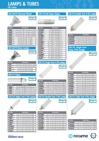 807LAMPS & TUBESTogether we GENERATE VALUELED LampsLED GU10 Thermal Plastic LED CFL Single Turn Long 4 Pin Lamps Part No. Description16682 Thermal Plastic SMD - Dimmable 5w 2700K16699 Thermal Plastic SMD - Dimmable 5w 3000K16705 Thermal Plastic SMD - Dimmable 5w 4000K16712 Thermal Plastic SMD - Dimmable 5w 6500K16941 Thermal Plastic SMD - 5w 2700K16958 Thermal Plastic SMD - 5w 3000K16965 Thermal Plastic SMD - 5w 4000K16972 Thermal Plastic SMD - 5w 6500KLED GU10 Glass LampsLED T5 TubesPart No. Description12080 2ft/563mm 8W 4000K G5 AC Mains Only12097 3ft/863mm 12W 4000K G5 AC Mains Only12066 4ft/1149mm 16W 4000K G5 AC Mains Only12073 5ft/1449mm 20W 4000K G5 AC Mains OnlyLED T8 Full Glass TubesPart No. DescriptionLFT2WW 2ft / 588mm 9W 3000K G13LFT2CW 2ft / 588mm 9W 4000K G13LFT2DL 2ft / 588mm 9W 6500K G13LFT3WW 3ft / 894mm 12W 3000K G13LFT3CW 3ft / 894mm 12W 4000K G13LFT3DL 3ft / 894mm 12W 6500K G13LFT4WW 4ft / 1198mm 17.5W 3000K G13LFT4CW 4ft / 1198mm 17.5W 4000K G13LFT4DL 4ft / 1198mm 17.5W 6500K G13LFT5WW 5ft / 1500mm 22W 3000K G13LFT5CW 5ft / 1500mm 22W 4000K G13LFT5DL 5ft / 1500mm 22W 6500K G13LFT6WW 6ft / 1800mm 24W 3000K G13LFT6CW 6ft / 1800mm 24W 4000K G13LFT6DL 6ft / 1800mm 24W 6500K G13LED CFL Single Turn 2 Pin LampsPart No. DescriptionLS7WW S Type 2 Pin 3W (7W Equivalent) 3000KLS7CW S Type 2 Pin 3W (7W Equivalent) 4000KLS7DL S Type 2 Pin 3W (7W Equivalent) 6500KLS9WW S Type 2 Pin 4.5W (9W Equivalent) 3000KLS9CW S Type 2 Pin 4.5W (9W Equivalent) 4000KLS9DL S Type 2 Pin 4.5W (9W Equivalent) 6500KLS11WW S Type 2 Pin 5W (11W Equivalent) 3000KLS11CW S Type 2 Pin 5W (11W Equivalent) 4000KLS11DL S Type 2 Pin 5W (11W Equivalent) 6500KLED CFL Single Turn 4 Pin LampsPart No. DescriptionLSE7WW SE Type 4 Pin 3W (7W Equivalent) 3000KLSE7CW SE Type 4 Pin 3W (7W Equivalent) 4000KLSE9WW SE Type 4 Pin 4.5W (9W Equivalent) 3000KLSE9CW SE Type 4 Pin 4.5W (9W Equivalent) 4000KLSE11WW SE Type 4 Pin 5W (11W Equivalent) 3000KLSE11CW SE Type 4 Pin 5W (11W Equivalent) 4000KLED CFL Double Turn 2 Pin Lamps Part No. DescriptionLD10WW D Type 2 Pin 4.5W (10W Equivalent) 3000KLD10CW D Type 2 Pin 4.5W (10W Equivalent) 4000KLD13WW D Type 2 Pin 5W (13W Equivalent) 3000KLD13CW D Type 2 Pin 5W (13W Equivalent) 4000KLD18WW D Type 2 Pin 6W (18W Equivalent) 3000KLD18CW D Type 2 Pin 6W (18W Equivalent) 4000KLD26WW D Type 2 Pin 9W (26W Equivalent) 3000KLD26CW D Type 2 Pin 9W (26W Equivalent) 4000KLED CFL Double Turn 4 Pin LampsPart No. DescriptionLDE18WW DE Type 4 Pin 6W (18W Equivalent) 3000KLDE18CW DE Type 4 Pin 6W (18W Equivalent) 4000KLDE26WW DE Type 4 Pin 9W (26W Equivalent) 3000KLDE26CW DE Type 4 Pin 9W (26W Equivalent) 4000KLED CFL Triple Turn 4 Pin Lamps Part No. DescriptionLTE32WW TE Type 4 Pin 10W (32W Equivalent) 3000KLTE32CW TE Type 4 Pin 10W (32W Equivalent) 4000KLTE42WW TE Type 4 Pin 13W (42W Equivalent) 3000KLTE42CW TE Type 4 Pin 13W (42W Equivalent) 4000KPart No. DescriptionLL18WW L Type 4 Pin 8W (18W Equivalent) 3000KLL18CW L Type 4 Pin 8W (18W Equivalent) 4000KLL24WW L Type 4 Pin 12W (24W Equivalent) 3000KLL24CW L Type 4 Pin 12W (24W Equivalent) 4000KLL36WW L Type 4 Pin 18W (36W Equivalent) 3000KLL36CW L Type 4 Pin 18W (36W Equivalent) 4000KLL40WW L Type 4 Pin 20W (40W Equivalent) 3000KLL40CW L Type 4 Pin 20W (40W Equivalent) 4000KLL55WW L Type 4 Pin 24W (55W Equivalent) 3000KLL55CW L Type 4 Pin 24W (55W Equivalent) 4000KPart No. Description6102 LED GU10 Glass 4W SMD Dimmable 2700K6119 LED GU10 Glass 5W SMD Dimmable 4000K4870 LED GU10 Glass SMD 4.5W 2700K4887 LED GU10 Glass SMD 4.5W 4000K