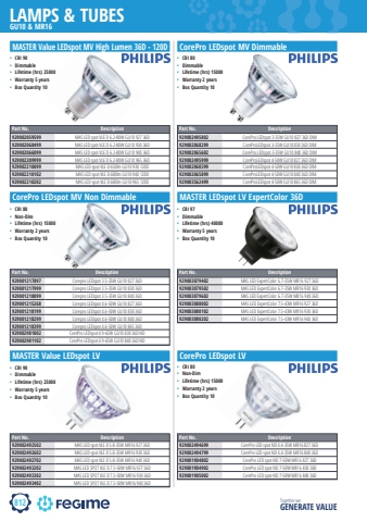 812LAMPS & TUBESTogether we GENERATE VALUEphilipsGU10 & MR16MASTER Value LEDspot MV High Lumen 36D - 120D%u2022 CRI 90%u2022 Dimmable%u2022 Lifetime (hrs) 25000%u2022 Warranty 5 years%u2022 Box Quantity 10Part No. Description929002059599 MAS LED spot VLE D 6.2-80W GU10 927 36D929002068499 MAS LED spot VLE D 6.2-80W GU10 930 36D929002066099 MAS LED spot VLE D 6.2-80W GU10 940 36D929002209999 MAS LED spot VLE D 6.2-80W GU10 965 36D929002210099 MAS LED spot VLE D 650lm GU10 930 120D929002210102 MAS LED spot VLE D 680lm GU10 940 120D929002210202 MAS LED spot VLE D 680lm GU10 965 120DMASTER Value LEDspot LV %u2022 CRI 90%u2022 Dimmable%u2022 Lifetime (hrs) 25000%u2022 Warranty 5 years%u2022 Box Quantity 10CorePro LEDspot MV Non Dimmable%u2022 CRI 80%u2022 Non-Dim%u2022 Lifetime (hrs) 15000%u2022 Warranty 2 years%u2022 Box Quantity 10CorePro LEDspot MV Dimmable%u2022 CRI 80%u2022 Dimmable%u2022 Lifetime (hrs) 15000%u2022 Warranty 2 years%u2022 Box Quantity 10Part No. Description929002495802 CorePro LEDspot 3-35W GU10 827 36D DIM929002068299 CoreProLEDspot 3-35W GU10 830 36D DIM929002065602 CorePro LEDspot 3-35W GU10 840 36D DIM929002495999 CoreProLEDspot 4-50W GU10 827 36D DIM929002068399 CoreProLEDspot 4-50W GU10 830 36D DIM929002065899 CoreProLEDspot 4-50W GU10 840 36D DIM929003562499 CoreProLEDspot 4-50W GU10 865 36D DIMCorePro LEDspot LV%u2022 CRI 80%u2022 Non-Dim%u2022 Lifetime (hrs) 15000%u2022 Warranty 2 years%u2022 Box Quantity 10MASTER LEDspot LV ExpertColor 36D%u2022 CRI 97%u2022 Dimmable%u2022 Lifetime (hrs) 40000%u2022 Warranty 5 years%u2022 Box Quantity 10Part No. Description929001217897 Corepro LEDspot 3.5-35W GU10 827 36D929001217999 Corepro LEDspot 3.5-35W GU10 830 36D929001218099 Corepro LEDspot 3.5-35W GU10 840 36D929001215268 Corepro LEDspot 4.6-50W GU10 827 36D929001218199 Corepro LEDspot 4.6-50W GU10 830 36D929001218299 Corepro LEDspot 4.6-50W GU10 840 36D929001218399 Corepro LEDspot 4.6-50W GU10 865 36D929002981002 CorePro LEDspot 4.9-65W GU10 830 36D ND929002981102 CorePro LEDspot 4.9-65W GU10 840 36D NDPart No. Description929003079402 MAS LED ExpertColor%u00a06.7-35W MR16 927 36D929003079502 MAS LED ExpertColor 6.7-35W MR16 930 36D929003079602 MAS LED ExpertColor%u00a06.7-35W MR16 940 36D929003080002 MAS LED ExpertColor 7.5-43W MR16 927 36D929003080102 MAS LED ExpertColor 7.5-43W MR16 930 36D929003080202 MAS LED ExpertColor 7.5-43W MR16 940 36DPart No. Description929002492502 MAS LED spot VLE D 5.8-35W MR16 927 36D929002492602 MAS LED spot VLE D 5.8-35W MR16 930 36D929002492702 MAS LED spot VLE D 5.8-35W MR16 940 36D929002493202 MAS LED SPOT VLE D 7.5-50W MR16 927 36D929002493302 MAS LED SPOT VLE D 7.5-50W MR16 930 36D929002493402 MAS LED SPOT VLE D 7.5-50W MR16 940 36DPart No. Description929002494699 CorePro LED spot ND 4.4-35W MR16 827 36D929002494799 CorePro LED spot ND 4.4-35W MR16 840 36D929001904802 CorePro LED spot ND 7-50W MR16 827 36D929001904902 CorePro LED spot ND 7-50W MR16 830 36D929001905002 CorePro LED spot ND 7-50W MR16 840 36D