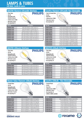 813LAMPS & TUBESTogether we GENERATE VALUE%u2022 Clear Glass%u2022 CRI 90%u2022 Dimmable with DimTone feature%u2022 Lifetime (hrs) 50,000%u2022 Warranty 5 years%u2022 Box Quantity 10%u2022 Clear Glass%u2022 CRI 90%u2022 Dimmable with DimTone feature%u2022 Lifetime (hrs) 25000%u2022 Warranty 5 years%u2022 Box Quantity 10LED Bulb, Candle & LustreMASTER Filament LEDcandle DimToneMaster Value Filament LEDbulb DimTone MASTER LEDlustre DimToneCorePro Filament LEDCandle Non DimmableMASTER LEDbulb DimTonePart No. Description929003011982 MAS LEDCandleDT2.5-25W E14 B35 CL G929003071202 MAS LEDCandleDT2.5-25W B22 B35 CL G929003012242 MASLEDCandleDT3.4-40WE14 927B35CL G929003012382 MAS LEDCandleDT3.4-40W E27 927 B35CL G929003012482 MAS LEDCandleDT3.4-40W B22 927 B35CL G929003012582 MAS LEDCandleDT3.4-40W B15 927 B35CL G929003013082 MAS LEDCandleDT3.4-40W E14927 BA35CL G929003013982 MAS LEDCandleDT5.9-60W E14 927 B35 CL GPart No. Description929001238492 CorePro LEDCandleND2-25W E14B35 827CL G929001238592 CorePro LEDCandleND2-25W E14BA35 827CLG929001815692 CorePro LEDCandleND2-25W ST35 E14 827CLG929001889719 CorePro LEDCandleND 2-25W B35 B22 827CLG929001889992 CorePro LEDCandleND4.3-40W E14 827B35CLG 929002028092 CorePro LEDCandleND4.3-40W B22 827B35CLG929001345292 CorePro LEDCandle ND6.5-60W B35E14827CLG929001345892 CorePro LEDCandle ND 2.2-25W B35 E14 FRG929001345392 CorePro LEDCandleND 2.2-25W BA35 E14 FRG929002028292 CorePro LEDCandleND4.3-40W E14 827B35FRG929002028292 CorePro LEDCandleND6.5-60W B35 E14827FRGPart No. Description929003012082 MAS LEDLusterDT2.5-25W E14 927 P45CL G929003012182 MAS LEDLusterDT2.5-25W E27 927 P45CL G929003013182 MAS LEDLusterDT3.4-40W E14 927 P45CL G929003013282 MAS LEDLusterDT3.5-40W E27 927 P45CL G929003014182 MAS LEDLusterDT5.9-60W E14 927 P45 CL G929003014282 MAS LEDLusterDT5.9-60W B22 927 P45CL GPart No. Description929003009982 MAS LEDBulb DT3.4-40W E27 927A60CL G929003010142 MAS LEDBulbDT3.4-40WB22 927A60CL G929003010342 MAS LEDBulbDT5.9-60W E27 927A60CL G929003010542 MAS LEDBulbDT5.9-60WB22 927A60CL G929003011182 MAS LEDBulb DT7.2-75W E27 927A60CL G929003011282 MAS LEDBulb DT7.2-75W B22 927A60CL G929003011582 MAS LEDBulbDT10.5-100W E27 927A60CLG929003011682 MAS LEDBulbDT10.5-100W B22 927A60CLGPart No. Description929003070702 MAS VLE LEDBulbD3.4-40W E27 927 A60 FR G929003010202 MAS VLE LEDBulbD 3.4-40W B22 A60 927FR G929003057799 MAS VLE LEDBulb D5.9-60W E27 927 A60 FRG929003010699 MAS VLE LEDBulbD5.9-60W B22 A60 927FR G929003058102 MAS VLE LEDBulb D7.8-75W E27 927 A60 FRG929003011402 MAS VLE LEDBulbD7.2-75W B22 A60 927 FR G929003058502 MAS VLE LEDBulbD11.2-100W E27 927 A60FRG929003011899 MAS VLE LEDBulbD10.5-100W B22 A60 927FRG%u2022 Frosted Glass%u2022 CRI 90%u2022 Dimmable with DimTone feature%u2022 Lifetime (hrs) 15000%u2022 Warranty 2.5 years%u2022 Box Quantity 10%u2022 Clear Glass%u2022 CRI 90%u2022 Dimmable with DimTone feature%u2022 Lifetime (hrs) 25000%u2022 Warranty 5 years%u2022 Box Quantity 10%u2022 Clear & Frosted Glass%u2022 CRI 80%u2022 Non-Dim%u2022 Lifetime (hrs) 15000%u2022 Warranty 2 years%u2022 Box Quantity 10CorePro LEDbulb - Non DimmablePart No. Description929003542599 MAS VLE LEDBulbD10.5-100W B22 A60 927FRG929003542999 CoreProLEDbulb ND 5.5-40W A60 E27 927929003543385 CoreProLEDbulb ND 5.5-40W A60 B22 927929003543799 CorePro LEDbulb ND 8-60W A60 E27 927929003544199 CorePro LEDbulb ND 8-60W A60 B22 927929003544599 CorePro LEDbulb ND 11-75W A60 E27 927929003003799 CorePro LEDbulb ND 11-75W A60 B22 927929003003899 CoreProLEDbulb ND 13-100W A60 E27 927%u2022 Frosted Plastic%u2022 CRI 90%u2022 Non-Dim%u2022 Lifetime (hrs) 15000%u2022 Warranty 2 years%u2022 Box Quantity 10%u2022 3000k & 4000K available