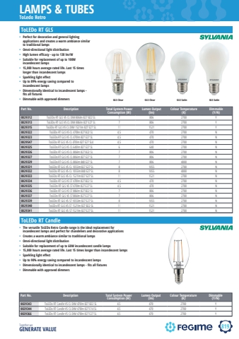 819LAMPS & TUBESTogether we GENERATE VALUEToLEDo RT GLS%u2022 Perfect for decorative and general lighting applications and creates a warm ambiance similar to traditional lamps%u2022 Omni-directional light distribution%u2022 High lumen efficacy - up to 138 lm/W%u2022 Suitable for replacement of up to 100W incandescent lamps%u2022 15,000 hours average rated life. Last 15 times longer than incandescent lamps%u2022 Sparkling light effect%u2022 Up to 89% energy saving compared to incandescent lamps%u2022 Dimensionally identical to incandescent lamps - fits all fixtures%u2022 Dimmable with approved dimmersPart No. Description Total System Power Consumption (W)Lumen Output (lm)Colour Temperature (K)Dimmable (Y/N)0029312 ToLEDo RT GLS V5 CL DIM 806lm 827 B22 SL 7 806 2700 Y0029313 ToLEDo RT GLS V5 CL DIM 806lm 827 E27 SL 7 806 2700 Y0029315 ToLEDo RT GLS V5 CL DIM 1521lm 827 E27 SL 11 1521 2700 Y0029322 ToLEDo RT GLS V5 CL 470lm 827 B22 SL 4.5 470 2700 N0029323 ToLEDo RT GLS V5 CL 470lm 827 E27 SL 4.5 470 2700 N0029547 ToLEDo RT GLS V5 CL 470lm 827 E27 SL4 4.5 470 2700 N0029325 ToLEDo RT GLS V5 CL 640lm 827 E27 SL 6 640 2700 N0029326 ToLEDo RT GLS V5 CL 806lm 827 B22 SL 7 806 2700 N0029327 ToLEDo RT GLS V5 CL 806lm 827 E27 SL 7 806 2700 N0029329 ToLEDo RT GLS V5 CL 806lm 840 E27 SL 7 806 4000 N0029331 ToLEDo RT GLS V5 CL 1055lm 827 E27 SL 8 1055 2700 N0029332 ToLEDo RT GLS V5 CL 1055lm 840 E27 SL 8 1055 4000 N0029333 ToLEDo RT GLS V5 CL 1521lm 827 E27 SL 11 1521 2700 N0029334 ToLEDo RT GLS V5 ST 470lm 827 B22 SL 4.5 470 2700 N0029335 ToLEDo RT GLS V5 ST 470lm 827 E27 SL 4.5 470 2700 N0029336 ToLEDo RT GLS V5 ST 806lm 827 B22 SL 7 806 2700 N0029337 ToLEDo RT GLS V5 ST 806lm 827 E27 SL 7 806 2700 N0029339 ToLEDo RT GLS V5 ST 1055lm 827 E27 SL 8 1055 2700 N0029340 ToLEDo RT GLS V5 ST 1521lm 827 B22 SL 11 1521 2700 N0029341 ToLEDo RT GLS V5 ST 1521lm 827 E27 SL 11 1521 2700 NGLS Clear GLS Clear GLS Satin GLS SatinPart No. Description Total System Power Consumption (W)Lumen Output (lm)Colour Temperature (K)Dimmable (Y/N)0029343 ToLEDo RT Candle V5 CL DIM 470lm 827 B22 SL 4.5 470 2700 Y0029344 ToLEDo RT Candle V5 CL DIM 470lm 827 E14 SL 4.5 470 2700 Y0029366 ToLEDo RT Candle V5 CL DIM 470lm 827 E27 SL 4.5 470 2700 YToLEDo RT Candle%u2022 The versatile ToLEDo Retro Candle range is the ideal replacement for incandescent lamps and perfect for chandeliers and decorative applications%u2022 Creates a warm ambiance similar to traditional lamps%u2022 Omni-directional light distribution%u2022 Suitable for replacement of up to 60W incandescent candle lamps%u2022 15,000 hours average rated life. Last 15 times longer than incandescent lamps%u2022 Sparkling light effect%u2022 Up to 90% energy saving compared to incandescent lamps%u2022 Dimensionally identical to incandescent lamps - fits all fixtures%u2022 Dimmable with approved dimmersToLedo Retro