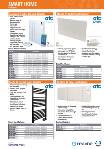 821SMART HOMETogether we GENERATE VALUERadiatorsSun Ray RF Electric Thermal Radiator%u2022 Smart Thermal Electric Radiator%u2022 Wireless control via Gateway and the Tevolve App%u2022 Voice control compatibility with Amazon Alexa and Google Assistant%u2022 PID Intelligent Control, Open Window Technology & Adaptive Start Features%u2022 Can be controlled remotely using the additional RF Gateway and Tevolve App%u2022 Also available in blackElectric thermal RadiatorsPart No. DescriptionRF350 Sun Ray RF Electric Thermal Radiator, 350W WhiteRF500 Sun Ray RF Electric Thermal Radiator, 500W WhiteRF750 Sun Ray RF Electric Thermal Radiator, 750W WhiteRF1000 Sun Ray RF Electric Thermal Radiator, 1000W WhiteRF1250 Sun Ray RF Electric Thermal Radiator, 1250W WhiteRF1500 Sun Ray RF Electric Thermal Radiator, 1500W WhiteRF1800 Sun Ray RF Electric Thermal Radiator, 1800W WhiteRF1000BL Sun Ray RF Electric Thermal Radiator, 1000W BlackRF1500BL Sun Ray RF Electric Thermal Radiator, 1500W BlackRF1800BL Sun Ray RF Electric Thermal Radiator, 1800W BlackRF-GATEWAY Sun Ray RF GatewayRF-Monitor Sun Ray RF MonitorMerida RF Digital Panel Radiator%u2022 Simple to program and operate%u2022 Large easy to read TFT Display%u2022 Operating Modes: Eco, Comfort, Frost Protection%u2022 Triac Electronic Thermostat%u2022 PID Intelligent Control%u2022 Open Window Technology%u2022 Adaptive Start Feature%u2022 Standalone control on radiator or wireless control via Gateway & Tevolve AppDigital Panel HeatersPart No. DescriptionMER500 Merida RF Digital Panel Heater, 500WMER750 Merida RF Digital Panel Heater, 750WMER1000 Merida RF Digital Panel Heater, 1000WMER1500 Merida RF Digital Panel Heater, 1500WMER2000 Merida RF Digital Panel Heater, 2000WPacific RF Electric Towel Radiator%u2022 Wireless control via Gateway and Tevolve App%u2022 Simple to install, program and operate%u2022 Large, easy to read TFT LCD display%u2022 4 Operating Modes: Eco, Comfort, Frost Protection, Landlord Mode%u2022 PID Intelligent control%u2022 Open Window Technology%u2022 Adaptive Start Feature%u2022 Available in white, black or chromeElectric Towel RadiatorsPart No. DescriptionRFTR780WH Pacifi c RF Electric Towel Radiator, 300W WhiteRFTR780BL Pacifi c RF Electric Towel Radiator, 300W BlackRFTR780CR Pacifi c RF Electric Towel Radiator, 150W ChromeRFTR920WH Pacifi c RF Electric Towel Radiator, 450W WhiteRFTR920BL Pacifi c RF Electric Towel Radiator, 450W BlackRFTR920CR Pacifi c RF Electric Towel Radiator, 250W ChromeNeptune RF Low Level Radiator%u2022 Wireless control via RF Gateway and Tevolve App%u2022 Voice control compatibility with Amazon Alexa and Google Assistant%u2022 4 Operating Modes: Eco, Comfort, Frost Protection, Landlord Mode%u2022 Filled with high quality thermic emission oil for quick heat-up time%u2022 PID Intelligent Control%u2022 Open Window Technology%u2022 Adaptive Start FeatureLow Level RadiatorsPart No. DescriptionLR950-RF Neptune RF Low Level Radiator, 950WLR1425-RF Neptune RF Low Level Radiator, 1425W