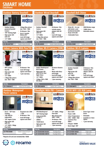 824SMART HOMETogether we GENERATE VALUELink2HomeOutdoor Battery DoorbellPart No. DescriptionL2H-BELLBATTERY Outdoor battery doorbell%u2022 Outdoor Battery powered Doorbell Camera%u2022 140%u00b0 Viewing Angle%u2022 High power LED with ICR%u2022 1/3%u201d CMOS%u2022 2 Mega Max picture size: 1920 %u00d7 1080%u2022 IR distance: 10m%u2022 Up to 3 months battery life*%u2022 Local still image capture and video*Outdoor Wired DoorbellPart No. DescriptionL2H-BELLWIRED Outdoor battery doorbell%u2022 Outdoor Doorbell Camera%u2022 High power LED with ICR%u2022 1/3%u201d CMOS%u2022 2 Mega Max picture size: 1920 %u00d7 1080%u2022 IR distance: 10m%u2022 Includes power adaptor with UK plug%u2022 Local still image capture and video*Doorbell Bell ChimePart No. DescriptionL2H-BELLCHIME Outdoor battery doorbell%u2022 Chime Kit %u2013 For use with batter y and hardwired doorbells%u2022 Power 5V1A USB%u2022 4 Selectable Tones%u2022 20M Wireless range%u2022 120DB chime %u2013 Selectable volumePart No. DescriptionL2H-ODRCAMERA Outdoor Wi-Fi CameraOutdoor Wi-Fi CameraPart No. DescriptionL2H-ODRCAMPT2 Outdoor battery doorbell%u2022 Outdoor Doorbell Camera%u2022 High power LED with ICR%u2022 1/3%u201d CMOS%u2022 2 Mega Max picture size: 1920 %u00d7 1080%u2022 IR distance: 10m%u2022 Includes power adaptor with UK plug%u2022 Local still image capture and video*%u2022 Outdoor Weatherproof Wi-Fi Camera%u2022 High power LED with ICR for clear Night Vision%u2022 1/3%u201d CMOS%u2022 2 Mega 1920 x 1080 HD Sensor%u2022 IR Sensor distance: 15m%u2022 Works with Alexa and Google%u2022 Local still image capture and video*%u2022 1 year warrantyPart No. DescriptionL2H-FLOODCAM2-BLACK Floodlight BlackL2H-FLOODCAM2-WHITE Floodlight White%u2022 IP54 Weatherproof%u2022 140%u00b0 Viewing Angle%u2022 Lamp power(W): 12.5W x 2%u2022 2000lm%u2022 125dB Alarm%u2022 High power LED with ICR%u2022 1/3%u201d CMOS, 2 Mega Pixel Stills%u2022 Max picture size: 2680 %u00d7 1440P%u2022 IR distance: 10m%u2022 Local still image capture and video*%u2022 1 year warrantyOutdoor Waterproof Porch CameraPart No. DescriptionL2H-PRHCAMBK Outdoor waterproof porch camera%u2022 Pan 0 %u2013 120%u00b0 Auto Tracking%u2022 12W 1000 lm (adjustable)%u2022 130%u00b0 Angle of view%u2022 High power LED with ICR%u2022 1/3%u201d CMOS, 3 Mega Pixel Stills%u2022 2K picture size: 2300 %u00d7 1296%u2022 IR distance: 10m%u2022 Local still image capture and video*%u2022 Base: GU10%u2022 Power: 4.8W%u2022 Colour Temperature: 2700 %u2013 6500K + RGB%u2022 Luminous Flux: 400lm%u2022 Lifespan: 15000H%u2022 Beam Angle: 100%u00b0%u2022 Driver Type: Linear Driver%u2022 Dimmable%u2022 Available in 4 Pack Option%u2022 1 year warrantyGU10 WIFI LED RGB Lamp Distributed by GH Lucas & CoOutdoor Wi-Fi Camera (ODR)Floodlight With PIR + CameraPart No. DescriptionL2H-CAMERAP/T Indoor Pan/Tilt Camera%u2022 WIFI camera%u2022 Pan/Tilt%u2022 High power LED with ICR%u2022 1/3%u201d CMOS%u2022 2 Mega Max picture size: 1920 %u00d7 1080%u2022 IR distance: 10m%u2022 Local still image capture and video*%u2022 1 year warrantyIndoor Camera With Pan/TiltPart No. DescriptionL2H-GU105W-SINGLE Single LampL2H-GU105W-4PK Pack of 4*Requires SD card (not included) Max 128GBDistributed by GH Lucas & Co Distributed by GH Lucas & CoDistributed by GH Lucas & Co Distributed by GH Lucas & Co Distributed by GH Lucas & CoDistributed by GH Lucas & CoDistributed by GH Lucas & Co Distributed by GH Lucas & Co