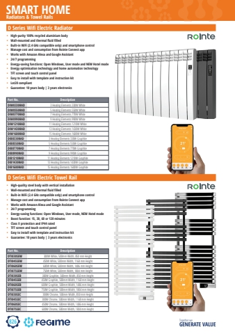 826SMART HOMETogether we GENERATE VALUED Series Wifi Electric Radiator%u2022 High-purity 100% recycled aluminium body%u2022 Wall-mounted and thermal fluid filled %u2022 Built-in WiFi (2.4 GHz compatible only) and smartphone control%u2022 Manage cost and consumption from Rointe Connect app%u2022 Works with Amazon Alexa and Google Assistant%u2022 24/7 programming%u2022 Energy-saving functions: Open Windows, User mode and NEW Hotel mode%u2022 Energy optimisation technology and home automation technology%u2022 TFT screen and touch control panel%u2022 Easy to install with template and instruction kit%u2022 Lot20 compliant%u2022 Guarantee: 10 years body | 3 years electronicsrointeRadiators & Towel RailsPart No. DescriptionDIW0330RAD 3 Heating Elements 330W WhiteDIW0550RAD 5 Heating Elements 550W WhiteDIW0770RAD 7 Heating Elements 770W WhiteDIW0990RAD 9 Heating Elements 990W WhiteDIW1210RAD 11 Heating Elements 1210W WhiteDIW1430RAD 13 Heating Elements 1430W WhiteDIW1600RAD 15 Heating Elements 1600W WhiteDIB0330RAD 3 Heating Elements 330W GraphiteDIB0550RAD 5 Heating Elements 550W GraphiteDIB0770RAD 7 Heating Elements 770W GraphiteDIB0990RAD 9 Heating Elements 990W GraphiteDIB1210RAD 11 Heating Elements 1210W GraphiteDIB1430RAD 13 Heating Elements 1430W GraphiteDIB1600RAD 15 Heating Elements 1600W GraphiteD Series Wifi Electric Towel Rail%u2022 High-quality steel body with vertical installation%u2022 Wall-mounted and thermal fluid filled %u2022 Built-in WiFi (2.4 GHz compatible only) and smartphone control%u2022 Manage cost and consumption from Rointe Connect app%u2022 Works with Amazon Alexa and Google Assistant%u2022 24/7 programming%u2022 Energy-saving functions: Open Windows, User mode, NEW Hotel mode%u2022 Boost function: 15, 30, 60 or 120 minutes%u2022 Class II protection and IP44 rated%u2022 TFT screen and touch control panel%u2022 Easy to install with template and instruction kit%u2022 Guarantee: 10 years body | 3 years electronicsPart No. DescriptionDTI030SEW 300W White, 500mm Width, 850 mm HeightDTI045SEW 450W White, 500mm Width, 1168 mm HeightDTI060SEW 600W White, 500mm Width, 1486 mm HeightDTI075SEW 750W White, 500mm Width, 1804 mm HeightDTI030SEB 300W Graphite, 500mm Width, 850 mm HeightDTI045SEB 450W Graphite, 500mm Width, 1168 mm HeightDTI060SEB 600W Graphite, 500mm Width, 1486 mm HeightDTI075SEB 750W Graphite, 500mm Width, 1804 mm HeightDTI030SEC 300W Chrome, 500mm Width, 850 mm HeightDTI045SEC 300W Chrome, 500mm Width, 1168 mm HeightDTI060SEC 450W Chrome, 500mm Width, 1486 mm HeightDTI075SEC 600W Chrome, 500mm Width, 1804 mm Height