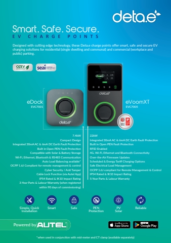 Smart. Safe. Secure.Designed with cutting edge technology, these Deta.e charge points offer smart, safe and secure EV charging solutions for residential (single dwelling and communal) and commercial (workplace and public) parking.22kWIntegrated 30mA AC & 6mA DC Earth Fault ProtectionBuilt in Open PEN Fault ProtectionRFID Enabled4G, Wi-Fi, Ethernet and Bluetooth ConnectivityOver-the-Air Firmware UpdatesScheduled & Energy Tariff Charging OptionsSafe Electrical Load ManagementOCPP 1.6J compliant for Remote Management & ControlIP54 Rated & IK10 Impact Rating5-Year Parts & Labour WarrantyeDockEVC7001eVoomXTEVC7005Powered by*when used in conjunction with mid-meter and CT clamp (available separately)7.4kWCompact DesignIntegrated 30mA AC & 6mA DC Earth Fault ProtectionBuilt in Open PEN Fault ProtectionCompatible with Solar & Battery StorageWi-Fi, Ethernet, Bluetooth & RS485 CommunicationAuto Load Balancing available*OCPP 1.6J Compliant for remote management & controlCyber Security / Anti TamperCable Lock Function (via Autel App)IP54 Rated & IK10 Impact Rating3-Year Parts & Labour Warranty (when registered within 90 days of commissioning)Simple, QuickInstallationSmart Safe PENProtectionPVSolarReliable