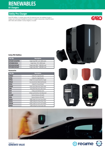 835 Together we GENERATE VALUERENEWABLESEV ChargersPart No. DescriptionEPCSO0132SIGIPEN Single Entity PME 1-ph 7.4KW socketEPCSO00332SIGI Single Entity 3-Ph, 22KW Socket EPCSC50132FIGIP Single Entity PME 7.4KW 5M LeadEPCSC80132FIGIP Single Entity PME 7.4KW 8M LeadEntity Pro Charger Part No. DescriptionEPIBSO Entity Pro Single Bracket EPIBS Entity Pro Single Bracket EPGSS Entity Pro Ground Stand for Single EPGCA Concrete Anchor Bolts And Bracket EPSSC Entity Pro Ground StandEPGSH Entity Stand Mounted Cable Hook EWH Entity Wall Mounted Cable Hook ELIB Entity Load Interface Unit ELIA Entity Load Interface Unit AdvancedELIANT External Antenna Kit (wifi ) EPEA External Antenna Kit (wifi ) EPFCB GARO Entity Pro Front Cover Black EPFCG GARO Entity Pro Front Cover Grey EPFCW GARO Entity Pro Front Cover White EPFCR GARO Entity Pro Front Cover Red AccessoriesEntity PRO WallboxEntity PRO Wallbox. A complete device with all component parts: An installation bracket, a charger and a front panel. Available for purchase in a single or dual version. Entity PRO comes with a fi xed cable available in various lengths or an outlet.