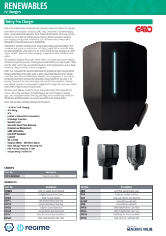 Together we GENERATE VALUERENEWABLES836Part No. DescriptionEPCSO00332SVGI Entity Pro 3-ph, 22KW %u2022 7.4 kW or 22KW Charging%u2022 IP54 Rating%u2022 IK10%u2022 LAN/4G or Meshed Wi-Fi Connectivity%u2022 DC Leakage Protection%u2022 Movable Socket%u2022 Automatic Smart Phase Balancing%u2022 Dynamic Load Management%u2022 GARO Connect App%u2022 Fully OCPP Compliant%u2022 Lockable%u2022 IEC Certified%u2022 Integrated Meter - MID Meter Option%u2022 Up to 4 Charge Points Per Mounting Pole%u2022 PME Protection Optional 7.4 kW%u2022 Independently Certified TUVEntity Pro ChargerPart No. DescriptionEPIBDO Entity Pro Double Bracket Without EPPC Entity Pro Protection Front Cover EPIBD Entity Pro Dual Bracket EPPFS Entity Pro Pole Mount Back PlateEPPFD Entity Pro Pole Mount Back Plate EPGSD Entity Pro Ground Stand Dual EPGCA Concrete Anchor Bolts And Bracket EPSSC Entity Pro Ground Stand InstallationEPGSH Entity Stand Mounted Cable Hook AccessoriesEV ChargersEntity is the next-generation charging box with innovation, safety and quality at the fi ngertipsof EV drivers across the globe. Introducing GARO Entity, a new series of complete charging boxes. Future-proofed and adapted for harsh climates like the Nordics. We%u2019ve made it easier than ever for you to have full control over your charging. Whether you want to schedule your charging according to time and electricity price, add several users or keep track of consumption, the GARO Connect app is there to help.GARO Entity is constantly connected as the charging box is always connected with 4G, Wi-Fi or network cable, so you can trust that your car is being charged. With its minimalist design and powerful software, GARO Entity Pro is the perfect solution for your charging needs. With support for both 1-phase and 3-phase charging, it charges all cars and is suitable for all car models.The Entity Pro is designed with an open interface which, as an owner, gives you the freedom to choose the operator you prefer, ensuring you are never locked into a single supplier. While using the GARO Connect app, you control the functions of the charging station, such as charge monitoring, billing, documents, and user management.Entity Pro is prepared for the cars of the future and the demands for higher charging speed through, among other things, three-phase. A smart solution that attracts everyone towards a fossil-free future. The smart DLM solution allows for smart energy meters to be connected directly in the load meter to ensure the Entity charge stations protect the main fuse of the property. Our smart 3-tier load control system stands out from the competition, allowing a more detailed connection in various electrical supply boards on large sites. Auto phase rotation adds further intelligent control of large EV loads.The future-proof software in Entity Pro means, among other things, that it is prepared for services such as Plug and Charge (15118) taking away the current struggles of multiple apps, cards and payment services. With plug and charge, the car automatically handles the identifi cation and charging when you connect your vehicle to the charging station.Hassle-free and easily accessible charging wherever you are.ChargersPart No. DescriptionEWH Entity Wall Mounted Cable Hook ELIB Entity Load Interface Unit Basic ELIA Entity Load Interface Unit AdvancedELIANT External Antenna Kit (wifi ) EPEA External Antenna Kit (wifi ) EPFCB GARO Entity Pro Front Cover Black EPFCG GARO Entity Pro Front Cover Grey EPFCW GARO Entity Pro Front Cover White EPFCR GARO Entity Pro Front Cover Red