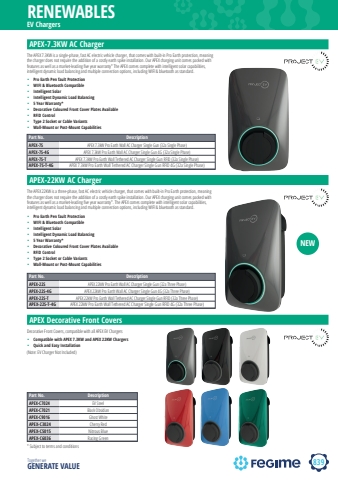 839 Together we GENERATE VALUERENEWABLESEV ChargersPart No. DescriptionAPEX-7S APEX 7.3kW Pro Earth Wall AC Charger Single Gun (32a Single Phase)APEX-7S-4G APEX 7.3kW Pro Earth Wall AC Charger Single Gun 4G (32a Single Phase)APEX-7S-T APEX 7.3kW Pro Earth Wall Tethered AC Charger Single Gun RFID (32a Single Phase)APEX-7S-T-4G APEX 7.3kW Pro Earth Wall Tethered AC Charger Single Gun RFID 4G (32a Single Phase)APEX-7.3KW AC Charger The APEX 7.3KW is a single-phase, fast AC electric vehicle charger, that comes with built-in Pro Earth protection, meaning the charger does not require the addition of a costly earth spike installation. Our APEX charging unit comes packed with features as well as a market-leading five year warranty* The APEX comes complete with intelligent solar capabilities, intelligent dynamic load balancing and multiple connection options, including WIFI & bluetooth as standard.%u2022 Pro Earth Pen fault Protection%u2022 WIFI & Bluetooth Compatible%u2022 Intelligent Solar%u2022 Intelligent Dynamic Load Balancing%u2022 5 Year Warranty*%u2022 Decorative Coloured Front Cover Plates Available%u2022 RFID Control%u2022 Type 2 Socket or Cable Variants%u2022 Wall-Mount or Post-Mount CapabilitiesPart No. DescriptionAPEX-22S APEX 22kW Pro Earth Wall AC Charger Single Gun (32a Three Phase)APEX-22S-4G APEX 22kW Pro Earth Wall AC Charger Single Gun 4G (32a Three Phase)APEX-22S-T APEX 22kW Pro Earth Wall Tethered AC Charger Single Gun RFID (32a Three Phase)APEX-22S-T-4G APEX 22kW Pro Earth Wall Tethered AC Charger Single Gun RFID 4G (32a Three Phase)APEX-22KW AC ChargerThe APEX 22KW is a three-phase, fast AC electric vehicle charger, that comes with built-in Pro Earth protection, meaning the charger does not require the addition of a costly earth spike installation. Our APEX charging unit comes packed with features as well as a market-leading five year warranty*. The APEX comes complete with intelligent solar capabilities, intelligent dynamic load balancing and multiple connection options, including WIFI & bluetooth as standard.%u2022 Pro Earth Pen fault Protection%u2022 WIFI & Bluetooth Compatible%u2022 Intelligent Solar%u2022 Intelligent Dynamic Load Balancing%u2022 5 Year Warranty*%u2022 Decorative Coloured Front Cover Plates Available%u2022 RFID Control%u2022 Type 2 Socket or Cable Variants%u2022 Wall-Mount or Post-Mount CapabilitiesPart No. DescriptionAPEX-C7024 EV SteelAPEX-C7021 Black ObsidianAPEX-C9016 Ghost WhiteAPEX-C3024 Cherry RedAPEX-C5015 Nitrous BlueAPEX-C6036 Racing GreenAPEX Decorative Front CoversDecorative Front Covers, compatible with all APEX EV Chargers%u2022 Compatible with APEX 7.3KW and APEX 22KW Chargers%u2022 Quick and Easy InstallationNEW* Subject to terms and conditions(Note: EV Charger Not Included)