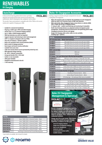 Together we GENERATE VALUERENEWABLES840Rolec EV Chargepoint AccessoriesEV Charging Part No. DescriptionEV Consumer Units %u2013 Metal Clad Enclosure:EVIN0010 20A Single Phase EV Consumer Unit with Type A RCBOEVIN0015 40A Single Phase EV Consumer Unit with Type A RCBO EVIN0070 20A Three Phase EV Consumer Unit with Type A RCBOEVIN0075 40A Three Phase EV Consumer Unit with Type A RCBORFID Cards & Fobs:RFID0010 RFID CardRFID0020 RFID FobCT Clamp %u2013 For Load Balancing & Monitoring Renewables:ACSR0125-F 100A up to 35mm%u00b2 Screened CT Clamp with 10m CableACSR0325 3x 100A up to 35mm%u00b2 Screened CT Clamps with 10m Cables for 3P ZuraACSR0380 120A up to 35mm%u00b2 QUBEV Smart CT Clamp with 5m CablePerifi c Fuse Protection DeviceACSR0520 Perifi c Device with 3x 900A up to 36mm%u00b2 Current SensorsACSR0530 Perifi c Device with 3x 900A up to 100mm%u00b2 Current SensorsChargepoint Protection Barriers & Signage:EVCB0020 Root Mount Protection Barrier %u2013 48mmEVCB0040 Surface Mount Protection Barrier %u2013 48mmEVPS0010 EV Parking Sign %u2013 A4 Landscape (Other sizes are available)EV Charging CablesEVPP0100 5m 32A Type 2 to Type 2 Charging CableEVPP0107 10m 32A Type 2 to Type 2 Charging CableEVPP0105 5m 32A Three Phase Type 2 to Type 2 Charging CableEVPP0108 10m 32A Three Phase Type 2 to Type 2 Charging Cable%u2022 Rolec%u2019s EV consumer units are ideal for the installation of an EV chargepoint which has built-in DC Protective Device & PME Fault Detection%u2022 RFID cards & fobs allow chargepoint hosts to issue drivers or vehicles (VRM) with a simple tap on/tap of charging solution%u2022 CT clamp & cable %u2013 enables load balancing and monitoring of renewables%u2022 Perific Fuse Protection Device is an advanced solution for dynamic power management, monitoring electrical infrastructure and optimising power usage%u2022 Chargepoint protection barriers and signage%u2022 Range of EV charging cables (other cables are also available, including Type 1 options)Stocking a range of accessories and spare components for new and existing Rolec EV chargepoints.AutoCharge%u2022 Suitable for commercial installations%u2022 Plug & go, mobile app or RFID controlled charging%u2022 Choose from 1x or 2x universal charging socket(s) %u2022 Up to 7.4kW or 22kW charging output(s)%u2022 PME fault detection (no earth rod required)%u2022 Supports dynamic load balancing & static load management%u2022 OCPP 1.6 compliant (integrates with any CPMS) %u2022 Over-the-air firmware / software updates%u2022 Built-in AC overload & fault current protection (RCBO)%u2022 Built-in 6mA DC leakage protection%u2022 Dual tamper and breach security notification%u2022 Lockable front access door%u2022 Cable lock security feature (can be permanently locked by user)%u2022 MID-approved energy metering%u2022 4G / Wi-Fi / Ethernet connectivity%u2022 Strong and durable IP54 / IK10 rated%u2022 Surface or root mountable%u2022 OZEV grant fundable%u2022 Designed & manufactured in the UK%u2022 3 Year warrantyA robust and hard-wearing pedestal that has been specifi cally designed and manufactured for both commercial and public facing environments. Ideal for development sites, workplaces, and car parks! This versatile, future-proof pedestal is compatible with all EVs/ PHEVs on the current market and is capable of charging up to 22kW. Part No. DescriptionROLEC0021B Up to 7.4kW (32A) 2 x Universal Sockets %u2013 BlackROLEC0021G Up to 7.4kW (32A) 2 x Universal Sockets %u2013 GreyROLEC0021W Up to 7.4kW (32A) 2 x Universal Sockets %u2013 WhiteROLEC0023B Up to 22kW (32A) 2 x Universal Sockets %u2013 BlackROLEC0023G Up to 22kW (32A) 2 x Universal Sockets %u2013 GreyROLEC0023W Up to 22kW (32A) 2 x Universal Sockets %u2013 WhiteGMPG0010 AutoCharge Galvanised Steel Ground Mounting Base1 way models are available. Ask in branch for detailsRolec EV Chargepoint Management & OperationMonta%u2019s chargepoint management platform provides businesses and organisations with the ability to deploy and self-manage their very own electric vehicle charging network. Ideal for workplace, fl eet, commercial and residential locations. Charge your EV on your terms. With Monta you have full control over your charging experience, at home or on the road.%u2022 Smart EV charging network%u2022 Simple host management interface%u2022 Easy to use chargepoints%u2022 Generate revenue%u2022 Customisable EV driver tariffs%u2022 Scalable solutionMonta%u2019s chargepoint management platform provides businesses and organisations with the ability to deploy and self-manage their very own electric vehicle charging network. Ideal for workplace, fl eet, commercial and Charge your EV on your terms. With Monta you have full control over your charging experience, at home or on the road.Simple host management interface