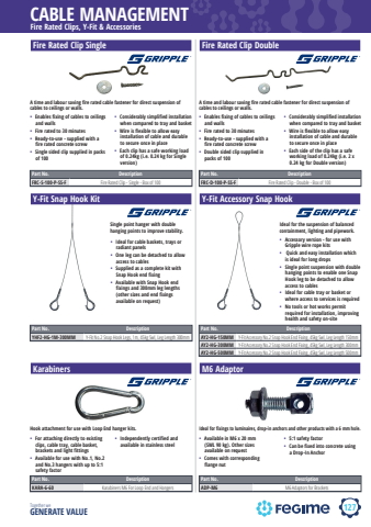 127CABLE MANAGEMENTTogether we GENERATE VALUE%u2022 Enables fixing of cables to ceilings and walls%u2022 Fire rated to 30 minutes%u2022 Ready-to-use - supplied with a fire rated concrete screw%u2022 Double sided clip supplied in packs of 100%u2022 Considerably simplified installation when compared to tray and basket%u2022 Wire is flexible to allow easy installation of cable and durable to secure once in place%u2022 Each side of the clip has a safe working load of 0.24kg (i.e. 2 x 0.24 kg for Double version)Fire Rated Clips, Y-Fit & AccessoriesFire Rated Clip SinglePart No. DescriptionFRC-S-100-P-SS-F Fire Rated Clip - Single - Box of 100Fire Rated Clip DoubleY-Fit Snap Hook Kit Y-Fit Accessory Snap HookPart No. DescriptionAY2-HG-150MM Y-Fit Accessory No.2 Snap Hook End Fixing, 45kg Swl, Leg Length 150mmAY2-HG-300MM Y-Fit Accessory No.2 Snap Hook End Fixing, 45kg Swl, Leg Length 300mmAY2-HG-500MM Y-Fit Accessory No.2 Snap Hook End Fixing, 45kg Swl, Leg Length 500mmKarabiners M6 AdaptorPart No. DescriptionFRC-D-100-P-SS-F Fire Rated Clip - Double - Box of 100A time and labour saving fire rated cable fastener for direct suspension of cables to ceilings or walls.%u2022 Enables fixing of cables to ceilings and walls%u2022 Fire rated to 30 minutes%u2022 Ready-to-use - supplied with a fire rated concrete screw%u2022 Single sided clip supplied in packs of 100%u2022 Considerably simplified installation when compared to tray and basket%u2022 Wire is flexible to allow easy installation of cable and durable to secure once in place%u2022 Each clip has a safe working load of 0.24kg (i.e. 0.24 kg for Single version)A time and labour saving fire rated cable fastener for direct suspension of cables to ceilings or walls.Single point hanger with double hanging points to improve stability.%u2022 Ideal for cable baskets, trays or radiant panels%u2022 One leg can be detached to allow access to cables%u2022 Supplied as a complete kit with Snap Hook end fixing%u2022 Available with Snap Hook end fixings and 300mm leg lengths (other sizes and end fixings available on request)Ideal for the suspension of balanced containment, lighting and pipework.%u2022 Accessory version - for use with Gripple wire rope kits%u2022 Quick and easy installation which is ideal for long drops%u2022 Single point suspension with double hanging points to enable one Snap Hook leg to be detached to allow access to cables%u2022 Ideal for cable tray or basket or where access to services is required%u2022 No tools or hot works permit required for installation, improving health and safety on-siteHook attachment for use with Loop End hanger kits.%u2022 For attaching directly to existing clips, cable tray, cable basket, brackets and light fittings%u2022 Available for use with No.1, No.2 and No.3 hangers with up to 5:1 safety factor%u2022 Independently certified and available in stainless steelIdeal for fixings to luminaires, drop-in anchors and other products with a 6 mm hole.%u2022 Available in M6 x 20 mm (SWL 90 kg). Other sizes available on request%u2022 Comes with corresponding flange nut%u2022 5:1 safety factor%u2022 Can be fixed into concrete using a Drop-In AnchorPart No. DescriptionYHF2-HG-1M-300MM Y-Fit No.2 Snap Hook Legs, 1m, 45kg Swl, Leg Length 300mmPart No. DescriptionKARA-6-60 Karabiners M6 For Loop End and HangersPart No. DescriptionADP-M6 M6 Adaptors for Brackets