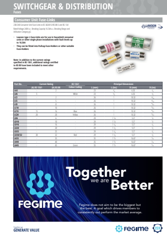 359SWITCHGEAR & DISTRIBUTIONTogether we GENERATE VALUEFusesConsumer Unit Fuse-LinksPart No. Current Rating BS 1361Colour CodingPrincipal Dimensions(A) BS 1361 (A) BS 88 L (mm) L (ins) D (mm) D (ins)LA2 - 2 - 23 7/8 6.35 1/4LA5 5 - White 23 7/8 6.35 1/4LC2 - 2 - 26 1 10.32 13/32LC5 - 5 - 26 1 10.32 13/32LC8 - 8 - 26 1 10.32 13/32LC10 - 10 - 26 1 10.32 13/32LC15 15 16 Blue 26 1 10.32 13/32LC20 20 20 Yellow 26 1 10.32 13/32LD6 - 6 - 29 1 1/8 12.7 1/2LD10 - 10 - 29 1 1/8 12.7 1/2LD16 - 16 - 29 1 1/8 12.7 1/2LD20 - 20 - 29 1 1/8 12.7 1/2LD25 - 25 - 29 1 1/8 12.7 1/2LD30/32 30 32 Red 29 1 1/8 12.7 1/2LK35 - 35 - 35 1 3/4 16.67 1/32LK40 - 40 - 35 1 3/4 16.67 1/32LK45 - 45 Green 35 1 3/4 16.67 1/32%u2022 Lawson type L Fuse-Links are for use in household consumer units or other single phase installations with fault levels up to 16.SkA%u2022 They can be fitted into Pullcap Fuse-Holders or other suitable Fuse-Holders230/240 Consumer Unit Fuse-Links to IEC 60269-3/BS 88-3 and BS 1361Rated Voltage 240V a.c. Breaking Capacity 16.SkA a.c. Breaking Range and Utilisation Category gGNote: In addition to the current ratings specified in BS 1361, additional ratings certified to BS 88 have been included to meet other requirements.Together Better we areFegime does not aim to be the biggest but the best. A goal which drives members to consistently out perform the market average.