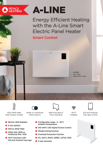 electric radiatorspitacsWi-Fi EnabledWhite or Anthracitefinish optionsWall-mounted or Floor-standingiOS and Android Tuya app control500%u20132400 Watt Heat Output modelsn Electric Wall Radiatorn 6 size optionsn 500 to 2400 Wattn White RAL 9016 or Anthracite RAL 7016n Wi-Fi functions with iOS and Android Tuya appn Configurable range : 5 - 35%u00b0C ambient temperaturen 100-240V LED Digital Screen Controln Weekly timing functionn Overheat Protection functionn CE, UKCA, RoHS, WEEE, LOT20, IP24n 2 year warrantyEnergy Efficient Heating with the A-Line Smart Electric Panel HeaterSmart ControlAL75W 750 Watt White RAL 9016