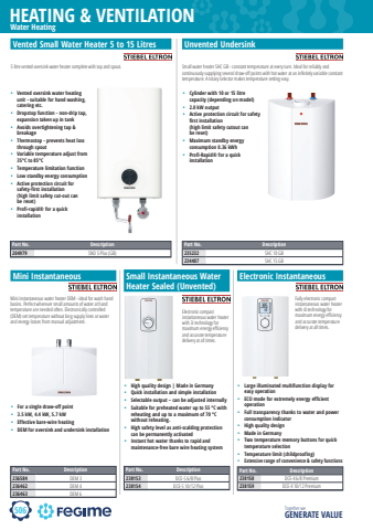 506HEATING & VENTILATIONTogether we GENERATE VALUEstiebel eltronWater HeatingPart No. Description236584 DEM 3236462 DEM 4236463 DEM 65 litre vented oversink water heater complete with tap and spout. Small water heater SHC GB - constant temperature at every turn. Ideal for reliably and continuously supplying several draw-off points with hot water at an infinitely variable constant temperature. A rotary selector makes temperature setting easy.Vented Small Water Heater 5 to 15 Litres Unvented UndersinkPart No. Description238153 DCE-S 6/8 Plus238154 DCE-S 10/12 PlusPart No. Description238158 DCE-X 6/8 Premium238159 DCE-X 10/12 PremiumPart No. Description235232 SHC 10 GB234407 SHC 15 GBPart No. Description204979 SNO 5 Plus (GB)%u2022 Vented oversink water heating unit - suitable for hand washing, catering etc.%u2022 Dropstop function - non-drip tap, expansion taken up in tank%u2022 Avoids overtightening tap & breakage%u2022 Thermostop - prevents heat loss through spout%u2022 Variable temperature adjust from 35%u00b0C to 85%u00b0C%u2022 Temperature limitation function%u2022 Low standby energy consumption%u2022 Active protection circuit for safety-first installation (high limit safety cut-out can be reset)%u2022 Profi-rapid%u00ae for a quick installation%u2022 Cylinder with 10 or 15 litre capacity (depending on model)%u2022 2.0 kW output%u2022 Active protection circuit for safety first installation (high limit safety cutout can be reset)%u2022 Maximum standby energy consumption 0.36 kWh%u2022 Profi-Rapid%u00ae for a quick installationMini InstantaneousMini instantaneous water heater DEM - ideal for wash hand basins. Perfect wherever small amounts of water at hand temperature are needed often. Electronically controlled (DEM) set temperature without long supply lines or water and energy losses from manual adjustment.Electronic compact instantaneous water heater with 3i technology for maximum energy efficiency and accurate temperature delivery at all times.Fully electronic compact instantaneous water heater with 4i technology for maximum energy efficiency and accurate temperature delivery at all times.Small Instantaneous Water Heater Sealed (Unvented)Electronic Instantaneous%u2022 For a single draw-off point%u2022 3.5 kW, 4.4 kW, 5.7 kW%u2022 Effective bare-wire heating%u2022 DEM for oversink and undersink installation%u2022 High quality design | Made in Germany%u2022 Quick installation and simple installation%u2022 Selectable output %u2013 can be adjusted internally%u2022 Suitable for preheated water up to 55 %u00b0C with reheating and up to a maximum of 70 %u00b0C without reheating.%u2022 High safety level as anti-scalding protection can be permanently activated%u2022 Instant hot water thanks to rapid and maintenance-free bare wire heating system%u2022 Large illuminated multifunction display for easy operation%u2022 ECO mode for extremely energy efficient operation%u2022 Full transparency thanks to water and power consumption indicator%u2022 High quality design%u2022 Made in Germany%u2022 Two temperature memory buttons for quick temperature selection%u2022 Temperature limit (childproofing)%u2022 Extensive range of convenience & safety functions