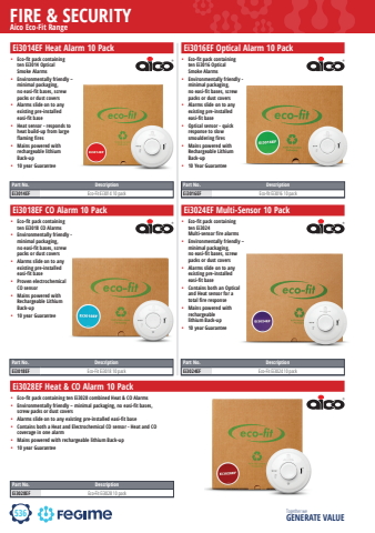 536FIRE & SECURITYTogether we GENERATE VALUEAico Eco-Fit RangeEi3014EF Heat Alarm 10 Pack Ei3016EF Optical Alarm 10 PackPart No. DescriptionEi3014EF Eco-Fit Ei3014 10 packPart No. DescriptionEi3016EF Eco-fit Ei3016 10 packPart No. DescriptionEi3018EF Eco-Fit Ei3018 10 packPart No. DescriptionEi3024EF Eco-Fit Ei3024 10 packEi3028EF Heat & CO Alarm 10 Pack%u2022 Eco-fit pack containing ten Ei3028 combined Heat & CO Alarms %u2022 Environmentally friendly %u2013 minimal packaging, no easi-fit bases, screw packs or dust covers%u2022 Alarms slide on to any existing pre-installed easi-fit base %u2022 Contains both a Heat and Electrochemical CO sensor - Heat and CO coverage in one alarm%u2022 Mains powered with rechargeable lithium Back-up%u2022 10 year GuaranteePart No. DescriptionEi3028EF Eco-Fit Ei3028 10 packEi3018EF CO Alarm 10 Pack Ei3024EF Multi-Sensor 10 Pack%u2022 Eco-fit pack containing ten Ei3014 Optical Smoke Alarms %u2022 Environmentally friendly %u2013 minimal packaging, no easi-fit bases, screw packs or dust covers%u2022 Alarms slide on to any existing pre-installed easi-fit base %u2022 Heat sensor - responds to heat build-up from large flaming fires %u2022 Mains powered with rechargeable lithium Back-up%u2022 10 year Guarantee%u2022 Eco-fit pack containing ten Ei3016 Optical Smoke Alarms%u2022 Environmentally friendly - minimal packaging, no easi-fit bases, screw packs or dust covers%u2022 Alarms slide on to any existing pre-installed easi-fit base%u2022 Optical sensor - quick response to slow smouldering fires%u2022 Mains powered with Rechargeable Lithium Back-up%u2022 10 Year Guarantee%u2022 Eco-fit pack containing ten Ei3018 CO Alarms%u2022 Environmentally friendly - minimal packaging, no easi-fit bases, screw packs or dust covers%u2022 Alarms slide on to any existing pre-installed easi-fit base%u2022 Proven electrochemical CO sensor%u2022 Mains powered with Rechargeable Lithium Back-up%u2022 10 year Guarantee%u2022 Eco-fit pack containing ten Ei3024 Multi-sensor fire alarms %u2022 Environmentally friendly %u2013 minimal packaging, no easi-fit bases, screw packs or dust covers%u2022 Alarms slide on to any existing pre-installed easi-fit base %u2022 Contains both an Optical and Heat sensor for a total fire response%u2022 Mains powered with rechargeable lithium Back-up%u2022 10 year Guarantee
