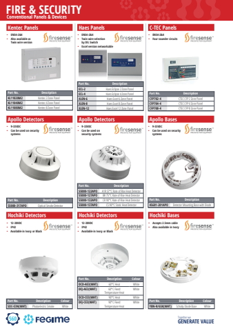 560FIRE & SECURITYTogether we GENERATE VALUEfire sense firesenseConventional Panels & DevicesKentec Panels%u2022 EN54-2&4%u2022 Also available as Twin wire versionApollo Detectors%u2022 9-33VDC%u2022 Can be used on security systemsHochiki Detectors%u2022 12-30VDC%u2022 IP42%u2022 Available in Ivory or BlackHochiki Bases%u2022 Accepts 2.5mm cable%u2022 Also available in IvoryHochiki Detectors%u2022 12-30VDC%u2022 IP42%u2022 Available in Ivory or BlackApollo Bases%u2022 9-33VDC%u2022 Can be used on security systemsC-TEC Panels%u2022 EN54-2&4%u2022 Four sounder circuitsHaes Panels%u2022 EN54-2&4%u2022 Twin wire selection by DIL Switch%u2022 Excel version networkableApollo Detectors%u2022 9-33VDC%u2022 Can be used on security systemsPart No. DescriptionKL11020M2 Kentec 2 Zone PanelKL11040M2 Kentec 4 Zone PanelKL11080M2 Kentec 8 Zone PanelPart No. Description55000-317APO Optical Smoke DetectorPart No. Description ColourSOC-E3N(WHT) Photoelectric Smoke WhitePart No. Description ColourYBN-R/6SK(WHT) Schotty Diode Base WhitePart No. Description ColourDCD-AE3(WHT) 60%u00b0C Heat WhiteDFJ-AE3(WHT) 60%u00b0C Fixed Temperature HeatWhiteDCD-CE3(WHT) 90%u00b0C Heat WhiteDFJ-CE3(WHT) 90%u00b0C Fixed Temperature HeatWhitePart No. Description45681-201APO Detector Mounting Base with DiodePart No. DescriptionCFP702-4 CTEC CFP 2 Zone PanelCFP704-4 CTEC CFP 4 Zone PanelCFP708-4 CTEC CFP 8 Zone PanelPart No. DescriptionECL-2 Haes Eclipse 2 Zone PanelECL-4 Haes Eclipse 4 Zone PanelXLEN-6 Haes Excel 6 Zone PanelXLEN-8 Haes Excel 8 Zone PanelXLEN-12 Haes Excel 12 Zone PanelPart No. Description55000-122APO A1R 57%u00b0C Rate of Rise Heat Detector55000-127APO BR 75%u00b0C Rate of Rise Heat Detector55000-132APO CR 90%u00b0C Rate of Rise Heat Detector55000-137APO CS 90%u00b0C Static Heat Detector