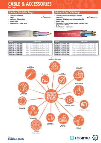 59CABLE & ACCESSORIESTogether we GENERATE VALUEStandard Fire Cable Range Enhanced Fire Cable Range%u2022 Conductor %u2013 Solid bare copper%u2022 Insulation %u2013 Silicon rubber%u2022 Sheath %u2013 LSZH%u2022 Sheath colours %u2013 Red or white%u2022 Conductor %u2013 Solid or stranded plain annealed copper wire%u2022 Insulation %u2013 Mica tape, covered by extruded LSZH%u2022 Sheath %u2013 LSZH%u2022 Core colours %u2013 Brown and blue (2 core) or brown, black, grey, and blue (4 core)%u2022 Sheath colours %u2013 Red or whitePart No. DescriptionSFX/FC-2C-1.5-FR60-STD 2 Core 1.5mm 300/500V Standard Flame-Flex 60SFX/FC-2C-2.5-FR60-STD 2 Core 2.5mm 300/500V Standard Flame-Flex 60SFX/FC-3C-1.5-FR60-STD 3 Core 1.5mm 300/500V Standard Flame-Flex 60SFX/FC-3C-2.5-FR60-STD 3 Core 2.5mm 300/500V Standard Flame-Flex 60SFX/FC-4C-1.5-FR60-STD 4 Core 1.5mm 300/500V Standard Flame-Flex 60SFX/FC-4C-2.5-FR60-STD 4 Core 2.5mm 300/500V Standard Flame-Flex 60Part No. DescriptionSFX/FC-2C-1.5-FR120-ENH 2 Core 1.5mm 300/500V Enhanced Flame-Flex 120SFX/FC-2C-2.5-FR120-ENH 2 Core 2.5mm 300/500V Enhanced Flame-Flex 120SFX/FC-3C-1.5-FR120-ENH 3 Core 1.5mm 300/500V Enhanced Flame-Flex 120SFX/FC-3C-2.5-FR120-ENH 3 Core 2.5mm 300/500V Enhanced Flame-Flex 120SFX/FC-4C-1.5-FR120-ENH 4 Core 1.5mm 300/500V Enhanced Flame-Flex 120SFX/FC-4C-2.5-FR120-ENH 4 Core 2.5mm 300/500V Enhanced Flame-Flex 120Fire Cable