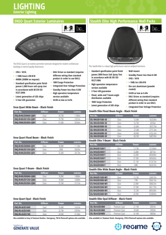 615LIGHTINGTogether we GENERATE VALUEasd lightingENSO Quart Exterior LuminairesPart No. Diffuser Power LumensENQ/B4KLED0840-QM1 Clear 10.7W 1149lmENQ/B4KLED1250-QM1 Clear 19.7W 2101lmENQ/B4KLED2050-QM1 Clear 31.6W 3576lmExterior Lighting%u2022 IP65 / IK10.%u2022 > 100k hours L90-B10%u2022 4000K (3000K on request)%u2022 Standard specification paint finish passes 2,000 hours salt spray test in accordance with BS EN ISO 9227:2006%u2022 Latest generation of LED chips%u2022 5 Year LED guarantee%u2022 DALI Driver as standard (requires different wiring than standard product in order to use DALI)%u2022 10KV Surge Protection%u2022 Integrated Over Voltage Protection%u2022 Standby Power less than 0.5W%u2022 High operation temperature version available%u2022 ULOR as low as 0.6%Stealth Elite High Performance Wall PacksEnso Quart Wide Beam - Black FinishThe ENSO Quart is an exterior perimeter luminaire designed for modern architectural buildings in need of quality illuminance.Part No. Diffuser Power LumensENQ/B4KLED0840-QF0 Clear 10.8W 1114lmENQ/B4KLED1250-QF0 Clear 20W 2042lmENQ/B4KLED2050-QF0 Clear 31.6W 3417lmEnso Quart Flood Beam - Black FinishPart No. Diffuser Power LumensENQ/B4KLED0840-QM2 Clear 10.8W 1008lmENQ/B4KLED1250-QM2 Clear 19.8W 1838lmENQ/B4KLED2050-QM2 Clear 31.5W 3151lmEnso Quart T-Beam - Black FinishPart No. Diffuser Power LumensENQ/BL4LED1600 Opal 15.6W 1631lmENQ/BL4LED2400 Opal 22.7W 2397lmENQ/BL4LED3100 Opal 29.9W 3124lmEnso Quart Opal - Black FinishAlso available in Grey & Titanium finishes. Emergency, PIR & Photocell options also available.Part No. Diffuser Power LumensSEL/B4LED1500-S0 Clear 13.4W 1633.8lmSEL/B4LED2000-S0 Clear 16.7W 2076lmSEL/B4LED3000-S0 Clear 22.6W 3073.7lmSEL/B4LED3500-S0 Clear 27.4W 3717.3lmSEL/B4LED4000-S0 Clear 30.9W 4152.2lmSEL/B4LED5000-S0 Clear 44.2W 5687.8lm%u2022 Standard specification paint finish passes 2000 hours Salt Spray Test in accordance with BS EN ISO 9227:2006%u2022 High operation temperature version available%u2022 5 Year LED guarantee%u2022 Flood, wide and T beam angle distribution available%u2022 10KV Surge Protection%u2022 Latest generation of LED chips%u2022 Wall mount%u2022 Standby Power less than 0.5W%u2022 IP65 / IK10%u2022 > 100k hrs L90-B10%u2022 Die cast aluminium (powder coated)%u2022 ULOR as low as 0.6%%u2022 DALI Driver as standard (requires different wiring than standard product in order to use DALI)%u2022 Integrated Over Voltage ProtectionStealth Elite Flood Beam Angle - Black FinishThe Stealth Elite is a robust high performance exterior wallpack luminaire.Stealth Elite Wide Beam Angle - Black FinishPart No. Diffuser Power LumensSEL/BL4LED2000 Premium Opal 21.1W 2081lmSEL/BL4LED3000 Premium Opal 29.6W 2903lmSEL/BL4LED4000 Premium Opal 41.3W 3883lmStealth Elite Opal Diffuser - Black FinishPart No. Diffuser Power LumensSEL/B4LED1500-T Clear 13.1W 1619.8lmSEL/B4LED2000-T Clear 16.8W 2071lmSEL/B4LED3000-T Clear 22.6W 3050.8lmSEL/B4LED3500-T Clear 27.3W 3694.6lmSEL/B4LED4000-T Clear 31.1W 4133.1lmSEL/B4LED5000-T Clear 44W 5634.7lmStealth Elite T-Beam - Black FinishAlso available in Titanium finish. Emergency, PIR & Photocell options also available.Part No. Diffuser Power LumensSEL/B4LED1500-M1 Clear 13.1W 1609.7lmSEL/B4LED2000-M1 Clear 17W 2064.1lmSEL/B4LED3000-M1 Clear 22.8W 3006.5lmSEL/B4LED3500-M1 Clear 27.3W 3651.7lmSEL/B4LED4000-M1 Clear 31.2W 4093.8lmSEL/B4LED5000-M1 Clear 43.9W 5548.8lm