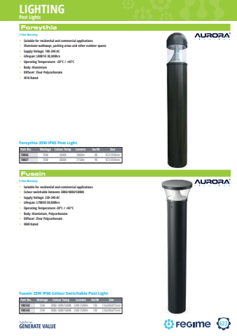 623LIGHTINGTogether we GENERATE VALUEPost LightsForsythiaFusain2 Year Warranty%u2022 Suitable for residential and commercial applications%u2022 Illuminate walkways, parking areas and other outdoor spaces%u2022 Supply Voltage: 100-240 AC%u2022 Lifespan: L80B1O 30,000hrs%u2022 Operating Temperature: -20%u00b0C / +45%u00b0C%u2022 Body: Aluminium%u2022 Diffuser: Clear Polycarbonate%u2022 IK10 RatedPart No. Wattage Colour Temp Lumens lm/W Size70806 35W 3000K 2800lm 80 167x1018mm70807 35W 4000K 3150lm 90 167x1018mmForsythia 35W IP65 Post Light5 Year Warranty%u2022 Suitable for residential and commercial applications%u2022 Colour switchable between 3000/4000/5000K%u2022 Supply Voltage: 220-240 AC%u2022 Lifespan: L70B50 50,000hrs%u2022 Operating Temperature:-30%u00b0C / +45%u00b0C%u2022 Body: Aluminium, Polycarbonate%u2022 Diffuser: Clear Polycarbonate%u2022 IK08 RatedPart No. Wattage Colour Temp Lumens lm/W Size100343 25W 3000/ 4000/5000K 2300-2500lm 100 133x200x975mm100342 25W 3000/ 4000/5000K 2300-2500lm 100 133x200x475mmFusain 25W IP66 Colour Switchable Post Light