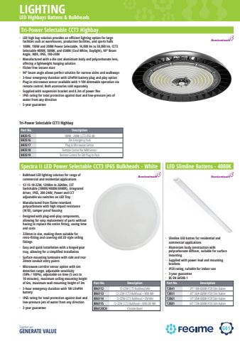 641LIGHTINGTogether we GENERATE VALUELED Highbays Battens & BulkheadsLED Slimline Battens - 4000KPart No. DescriptionT2041 2FT 18W 4000K IP20 Slim BattenT2051 4FT 36W 4000K IP20 Slim BattenT2061 5FT 50W 4000K IP20 Slim BattenT2081 6FT 72W 4000K IP20 Slim Batten%u2022 Slimline LED batten for residential and commercial applications%u2022 Aluminium body construction with polycarbonate diffuser, suitable for surface mounting%u2022 Supplied with power lead and mounting brackets%u2022 IP20 rating, suitable for indoor use%u2022 3-year guarantee%u2022 BS EN 60598-1Spectra II LED Power Selectable CCT3 IP65 Bulkheads - WhitePart No. DescriptionBR6112 12-22W CCT3 Bulkhead WHBR6113 12-22W CCT3 Bulkhead + MW WHBR6114 12-22W CCT3 Bulkhead + EM WHBR6115 12-22W CCT3 Bulkhead + MW EM WHBR6120CH Chrome Bezel%u2022 Bulkhead LED lighting solution for range of commercial and residential applications%u2022 12-15-18-22W, 1200lm to 2640lm, CCT Switchable (3000K/4000K/6000K), integrated driver, IP65, 200-240V, Power and CCT adjustable via switches on LED Tray%u2022 Manufactured from flame retardant polycarbonate with high impact resistance (IK10), tamper proof housing%u2022 Designed with plug-and-play components, allowing for easy replacement of parts without having to replace the entire fitting, saving time and costs%u2022 320mm in size, making them suitable for retro-fitting and covering old 2D style ceiling fittings%u2022 Easy and quick installation with a hinged gear tray, allowing for a simplified installation%u2022 Surface mounting luminaire with side and rear 20mm conduit entry points%u2022 Microwave corridor sensor option with 6m detection range, adjustable sensitivity (50% / 100%), adjustable on time (5 secs to 10 minutes), maximum ceiling mounting height of 6m, maximum wall mounting height of 3m%u2022 3-hour emergency duration with 1W LiFeP04 battery%u2022 IP65 rating for total protection against dust and low-pressure jets of water from any direction%u2022 3-year guaranteeTri-Power Selectable CCT3 Highbay%u2022 LED high bay solution provides an efficient lighting option for large facilities such as warehouses, production facilities, and sports halls%u2022 100W, 150W and 200W Power Selectable, 14,000 lm to 30,000 lm, CCT3 Selectable 4000K, 5000K, and 6500K (Cool White, Daylight), 90%u00b0 Beam Angle, IK09, IP65, 100-240V%u2022 Manufactured with a die cast aluminium body and polycarbonate lens, offering a lightweight hanging solution%u2022 Flicker free instant start%u2022 90%u00b0 beam angle allows perfect solution for narrow aisles and walkways%u2022 3-hour emergency duration with LiFeP04 battery plug and play option%u2022 Plug-in microwave sensor available with 1-10V dimmable operation via remote control. Both accessories sold separately%u2022 Supplied with suspension bracket and 0.3m of power flex%u2022 IP65 rating for total protection against dust and low-pressure jets of water from any direction%u2022 5-year guaranteePart No. DescriptionBR3515 100W - 200W CCT3 IP65 BKBR3516 3Hr Emergency PackBR3517 Plug-in Microwave SensorBR3518 Remote Control for MW SensorBR3519 Remote Control for EM Plug-In PackTri-Power Selectable CCT3 Highbay