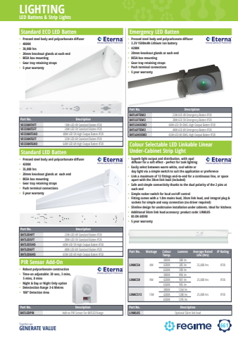 661LIGHTINGTogether we GENERATE VALUEeterna lightingLED Battens & Strip LightsStandard ECO LED BattenStandard LED BattenPIR Sensor Add-OnEmergency LED BattenColour Selectable LED Linkable Linear Under-Cabinet Strip Light%u2022 Pressed steel body and polycarbonate diffuser%u2022 4000K%u2022 30,000 hrs%u2022 20mm knockout glands at each end%u2022 BESA box mounting%u2022 Gear tray retaining straps%u2022 5 year warranty%u2022 Pressed steel body and polycarbonate diffuser%u2022 3.2V 1500mAh Lithium Ion battery%u2022 4200K%u2022 20mm knockout glands at each end%u2022 BESA box mounting%u2022 Gear tray retaining straps%u2022 Push terminal connections%u2022 5 year warranty%u2022 Pressed steel body and polycarbonate diffuser%u2022 4200K %u2022 35,000 hrs%u2022 20mm knockout glands at each end%u2022 BESA box mounting %u2022 Gear tray retaining straps%u2022 Push terminal connections%u2022 5 year warranty%u2022 Superb light output and distribution, with opal diffuser for a soft effect - perfect for task lighting%u2022 Easily select between warm white, cool white or day light via a simple switch to suit the application or preference%u2022 Link a maximum of 12 fittings end-to-end for a continuous line, or space apart with the 30cm link lead (included)%u2022 Safe and simple connectivity thanks to the dual polarity of the 2 pins at each end%u2022 Simple rocker switch for local on/off control%u2022 Fitting comes with a 1.8m mains lead, 30cm link lead, and integral plug & sockets for simple and easy connection (no driver required)%u2022 Slimline design for unobtrusive installation under cabinets. Ideal for kitchens%u2022 Additional 50cm link lead accessory: product code: LINKL05%u2022 BS EN 60598%u2022 5 year warranty%u2022 Robust polycarbonate construction%u2022 Time-on adjustable: 30 secs, 3 mins, 5 mins, 8 mins%u2022 Night & Day or Night Only option%u2022 Detectection Range 3-6 Metres%u2022 100%u00b0 Detection AreaPart No. DescriptionVECOBAT4FT 18W LED 4ft Standard Batten IP20VECOBAT5FT 24W LED 5ft Standard Batten IP20VECOBAT5HO 48W LED 5ft High Output Batten IP20VECOBAT6FT 32W LED 6ft Standard Batten IP20VECOBAT6HO 64W LED 6ft High Output Batten IP20Part No. DescriptionBATL4FTEM3 23W LED 4ft Emergency Batten IP20BATL5FTEM3 38W LED 5ft Emergency Batten IP20BATL5HOEM3 60W LED 5ft EMG.High Output Batten IP20BATL6FTEM3 48W LED 6ft Emergency Batten IP20BATL6HOEM3 65W LED 6ft EMG.High Output Batten IP20Part No. Wattage Colour Temp.Lumens Average Rated Life (Hrs)IP RatingLINKCS4 4W3000K 380 lm4200K 385 lm 25,000 hrs IP206500K 390 lmLINKCS9 9W3000K 896 lm4200K 901 lm 25,000 hrs IP206500K 905 lmLINKCS13 13W3000K 1264 lm4200K 1280 lm 25,000 hrs IP206500K 1295 lmPart No. DescriptionBATLEDPIR Add-on PIR Sensor For BATLED RangePart No. DescriptionBATLED4FT 23W LED 4ft Standard Batten IP20BATLED5FT 38W LED 5ft Standard Batten IP20BATLED5HO 60W LED 5ft High Output Batten IP20BATLED6FT 48W LED 6ft Standard Batten IP20BATLED6HO 65W LED 6ft High Output Batten IP20Part No. DescriptionLINKL05 Optional 50cm link lead